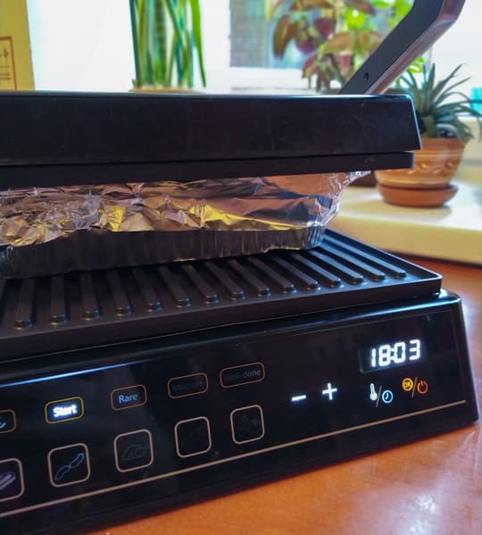 Пробовали мы печь бисквит и в электрогриле. Правда, не в обычном, а тоже в многофункциональном Redmond SteakMaster RGM-M813, способном, по заверениям производителя, заменить духовку. На рецепт бисквита из прилагающейся к устройству поваренной книги посмотрели с недоверием, но решили рискнуть и пекли его в форме из фольги 20 минут при температуре 170 градусов. Внешне он вышел совершенно бледным, но равномерно пропекся и оказался достаточно пышным и очень вкусным — отличной основой для тортика.