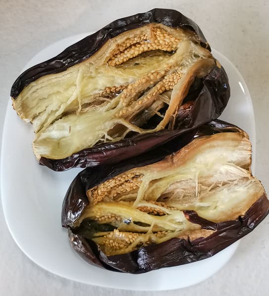 Запеченные таким образом баклажаны можно использовать для всевозможных заготовок, теплых салатов и овощных паштетов типа бабагануша и мутабаля.