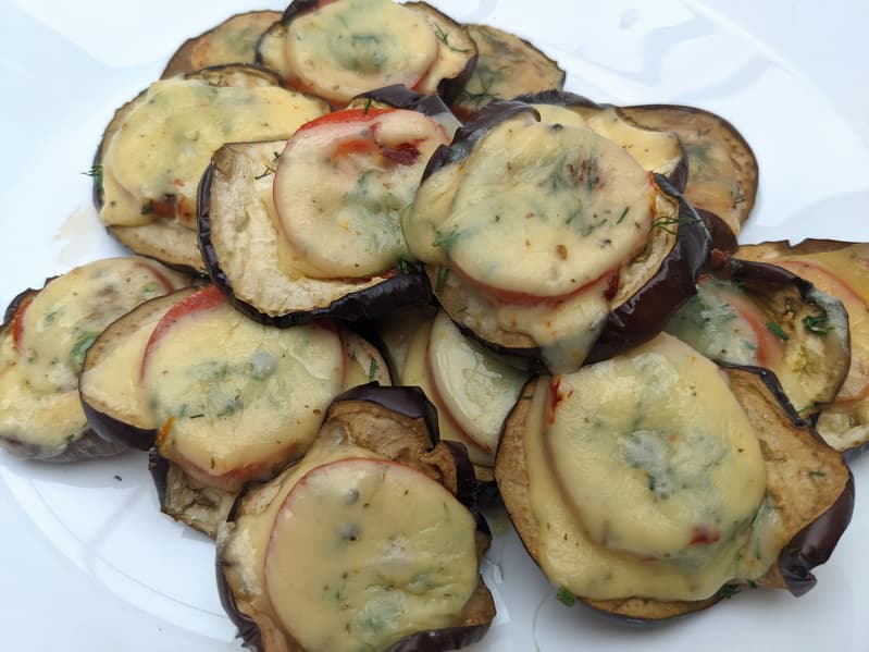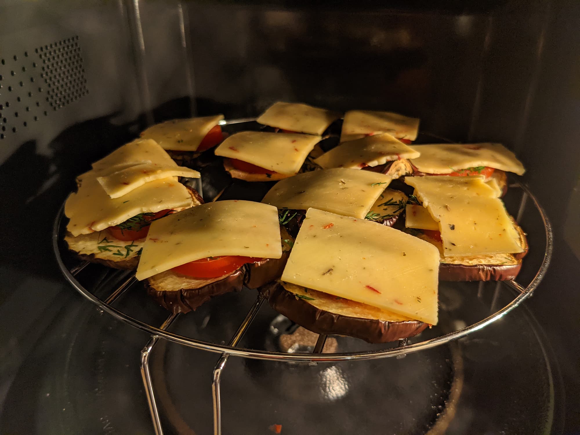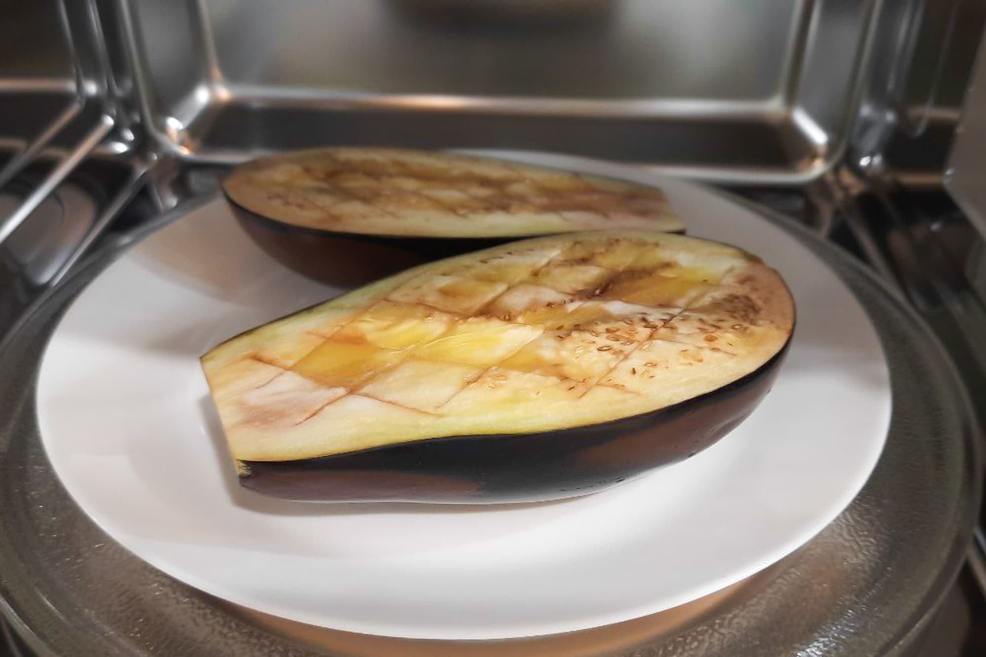 Если же использовать режим СВЧ+гриль, реализуемый во многих современных приборах, то сверху на овощах появится ароматная корочка — но лишь в том случае, если их хотя бы сбрызнуть, а лучше смазать растительным маслом, иначе они могут пересушиться. То же самое касается режима конвекции в СВЧ: сильный нагрев и обдув способны испортить баклажаны. Мы готовили баклажаны в таком режиме, тестируя микроволновую печь Redmond RM-2301D с керамическим грилем. Выбрали рецепт печеных баклажанов с помидорами и сыром: нарезали овощ поперек, разложили кружочки на решетку для гриля и включили комбинированный режим С2, который распределяет мощность микроволн и гриля в соотношении 36/64. Баклажаны приготовились до мягкости за десять минут, а потом мы разложили на каждом кусочке по ломтику помидора, добавили чеснока, пряностей и зелени, получившиеся «бутерброды» накрыли кусочками сыра и запекали всё еще три минуты, чтобы расплавился сыр.