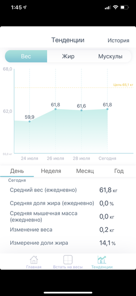 Для того чтобы сделать новое измерение, надо нажать на иконку «Встать на весы». Ну а если вы хотите в наглядной форме увидеть ваш прогресс — нажмите на «Тенденции». Причем данные можно посмотреть как по собственно весу, так и по жиру и мускулам.