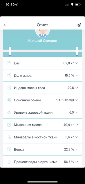 В общем, все очень просто, понятно и наглядно. Но постепенно замечаешь следующие нюансы. Во-первых, показатели жира и мускулов заметно варьируются от раза к разу, даже если измерять довольно часто. Очевидно, это свидетельствует о погрешности определения этих параметров. И во-вторых, нигде не указано, какими должны быть эти показатели в идеале. Да, тут, как говорится, Google в помощь. Но хотелось бы увидеть какой-то анализ результатов в самом приложении.