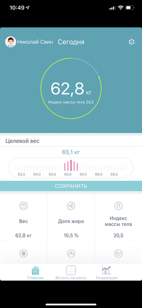 Сопряжение проходит без проблем — достаточно запустить его в приложении и встать на весы на несколько секунд. Дальше все будет работать автоматически. На главном экране отображается вес и индекс массы тела, ниже — шкала движения к целевому весу, а еще ниже — прочие данные по последнему измерению.