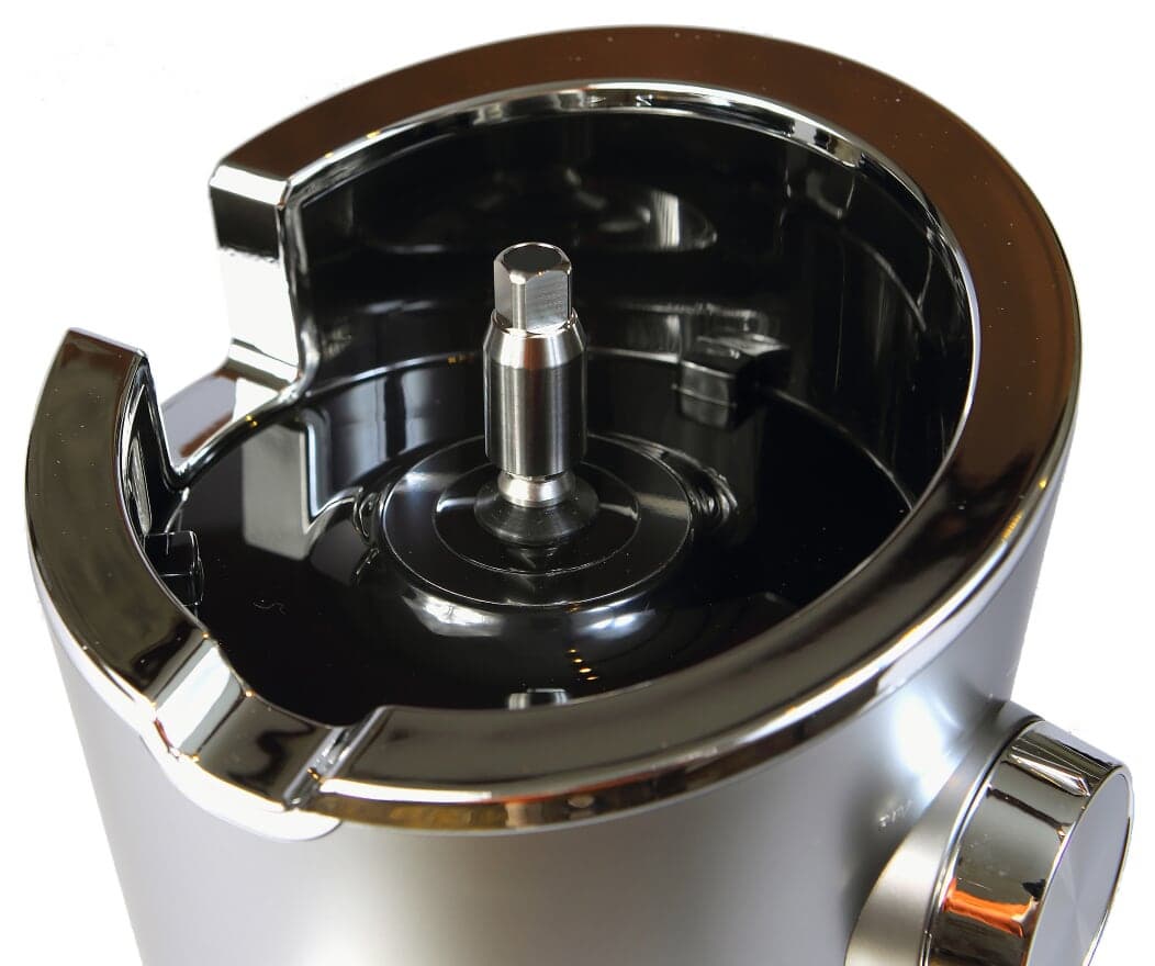 Корзина для отжима сделана из прозрачного высокопрочного пластика Tritan. Особенность корзины — автоматический клапан выхода жмыха. Производитель утверждает, что даже если клапан закрыт, он откроется, как только давление жмыха станет избыточным.