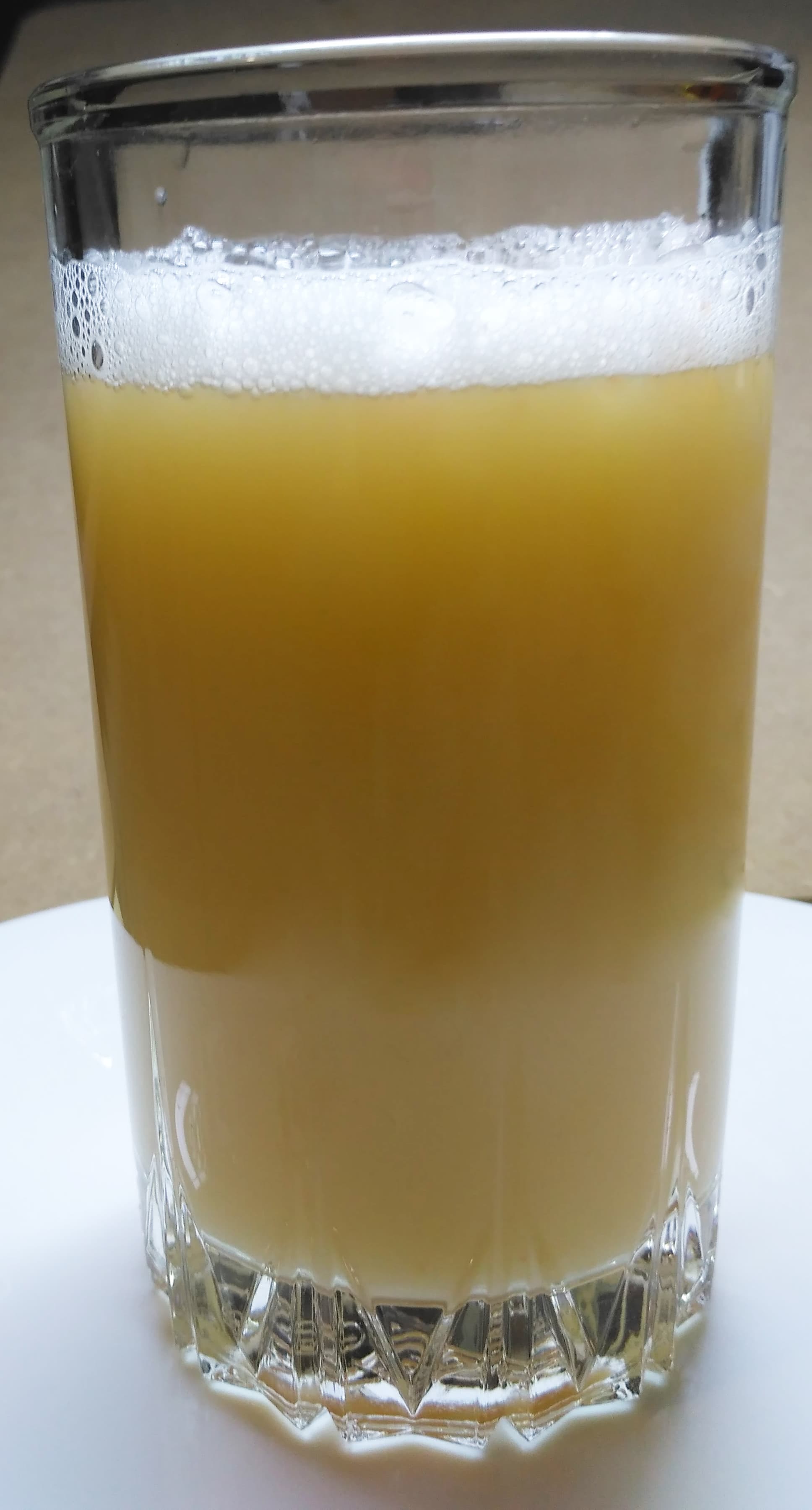 Итоговый объем напитка составил 270 г. Вкус нам понравился, банан и груша смягчают вкус лимона. Напиток особенно будет актуален осенью, так как содержит много витамина С и является неплохим профилактическим средством от простуды. Книга рецептов утверждает, что данный напиток облегчает кашель. К счастью, проверить это утверждение нам не удалось.