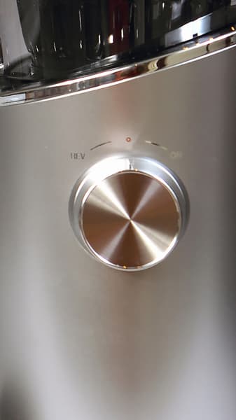 Среднее (вверх) положение переключателя соответствует положению «выключено». В этом состоянии соковыжималка готова к работе. Правое (от себя) положение переключателя (On) соответствует нормальному режиму работы (отжим сока). Переключатель в этом положении фиксируется: соковыжималка будет работать до тех пор, пока пользователь ее не отключит. Левое (на себя) положение переключателя соответствует режиму Reverse. В этом режиме шнек соковыжималки будет вращаться в обратную сторону, что может быть полезно, например, в случае, если частицы продуктов начали мешать вращению шнека. В режиме Reverse кнопка не фиксируется: обратное вращение будет происходить до тех пор, пока пользователь не отпустит регулятор.
