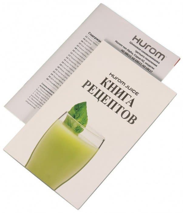 Отдельно стоит отметить книгу рецептов. Она представляет собой полноцветную брошюру объемом в 100 страниц, в которой можно найти множество рецептов соков и коктейлей на их основе. Тут можно встретить рецепты исцеляющих и оздоравливающих соков, соков, заряжающих энергией и улучшающих кровообращение, соков для подачи на вечеринках и соков, которые помогут при похмелье. Также в книге есть несколько рецептов для приготовления мороженого и фруктового льда.