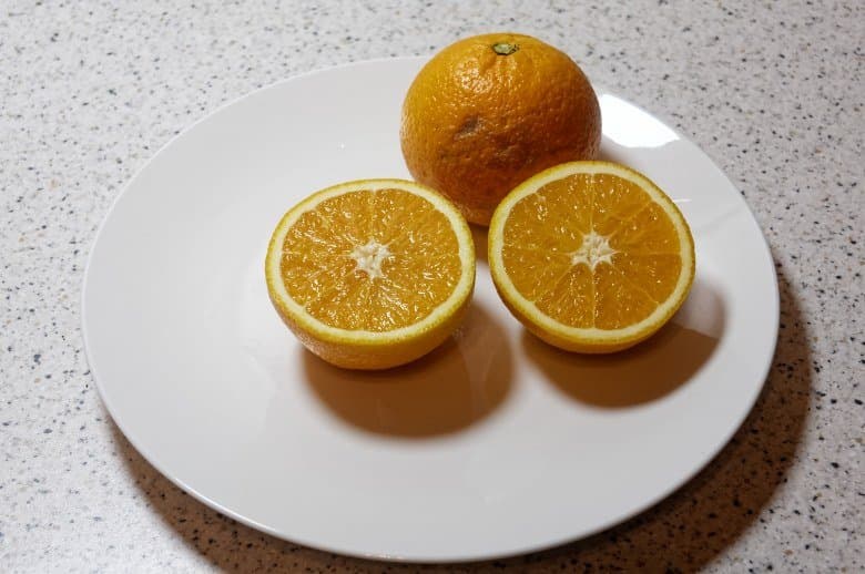 Для отжима цитрусовых мы взяли килограмм апельсинов (в нашем случае это оказалось ровно четыре штуки), разрезали их пополам и отжали сок.