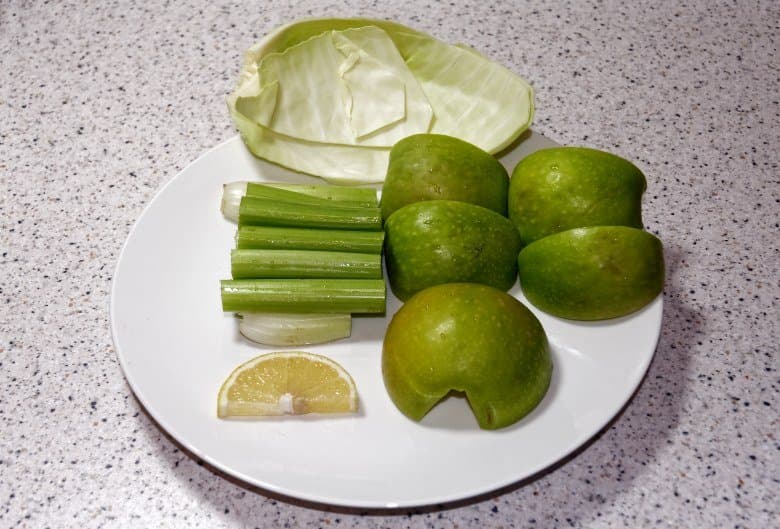 Подготовка ингредиентов стандартная: помыть и нарезать кусочками подходящего размера, лимон предварительно очистить от кожуры. В процессе отжима рекомендуется чередовать ингредиенты для наиболее равномерного перемешивания их соков.