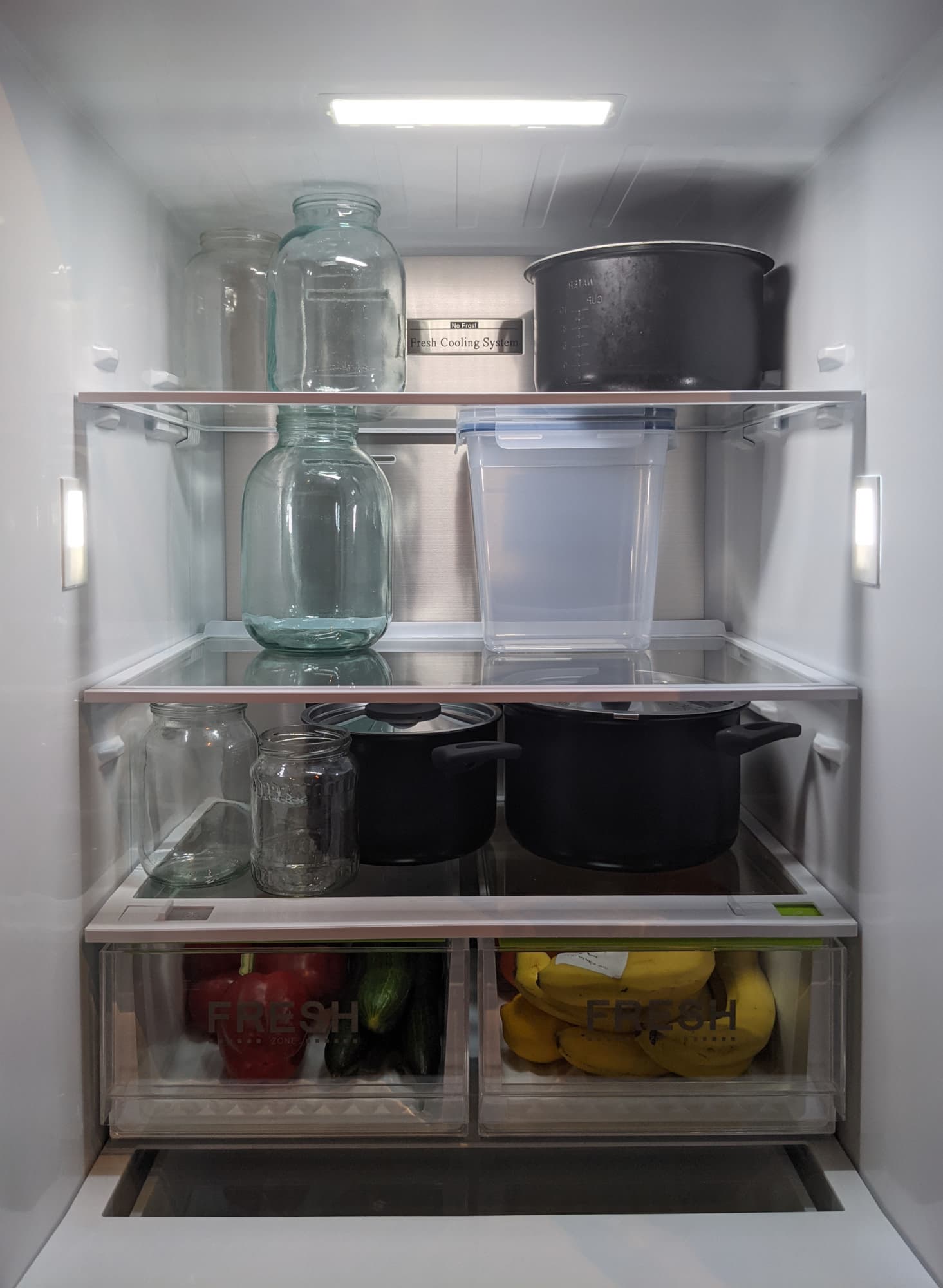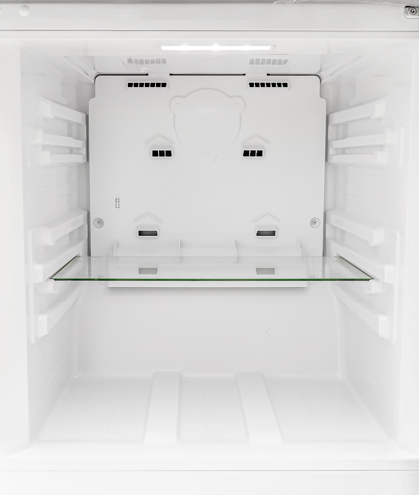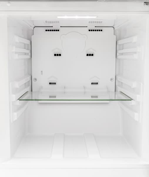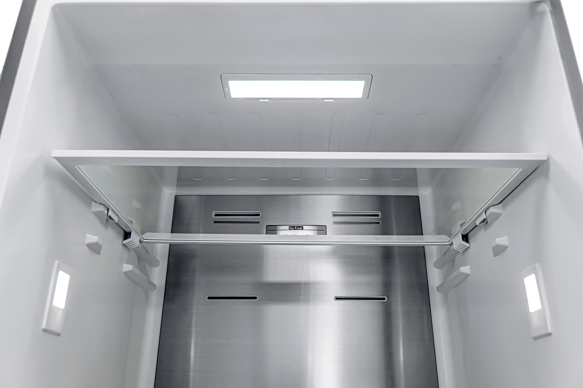 Холодильник подсвечен более крупным светодиодным светильником в потолке и двумя поменьше — на боковых стенках. Две верхних полки подвижные и могут изменять положение — у каждой из них две возможные позиции. Изготовлены они из толстого стекла с пластиковой окантовкой по всему периметру.