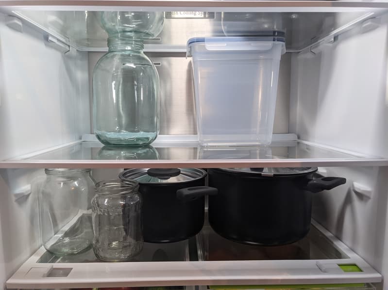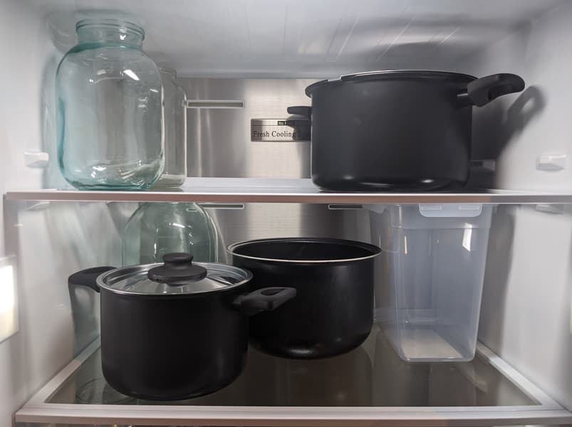 Чтобы проверить, как работает режим PowerFreeze и оценить замораживающую способность устройства, мы поместили контейнеры с водяным балластом чуть ниже комнатной (около 20 °C) температуры в предварительно охлажденный холодильник и включили функцию быстрой заморозки.