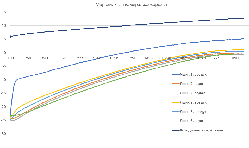 Чтобы оценить теплоизоляцию корпуса и понять, как долго удерживает холод отключенное от сети устройство, мы выключили предварительно охлажденный прибор с балластом и понаблюдали за изменением температуры.