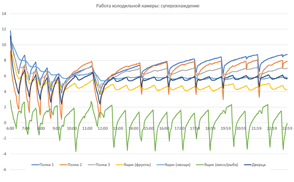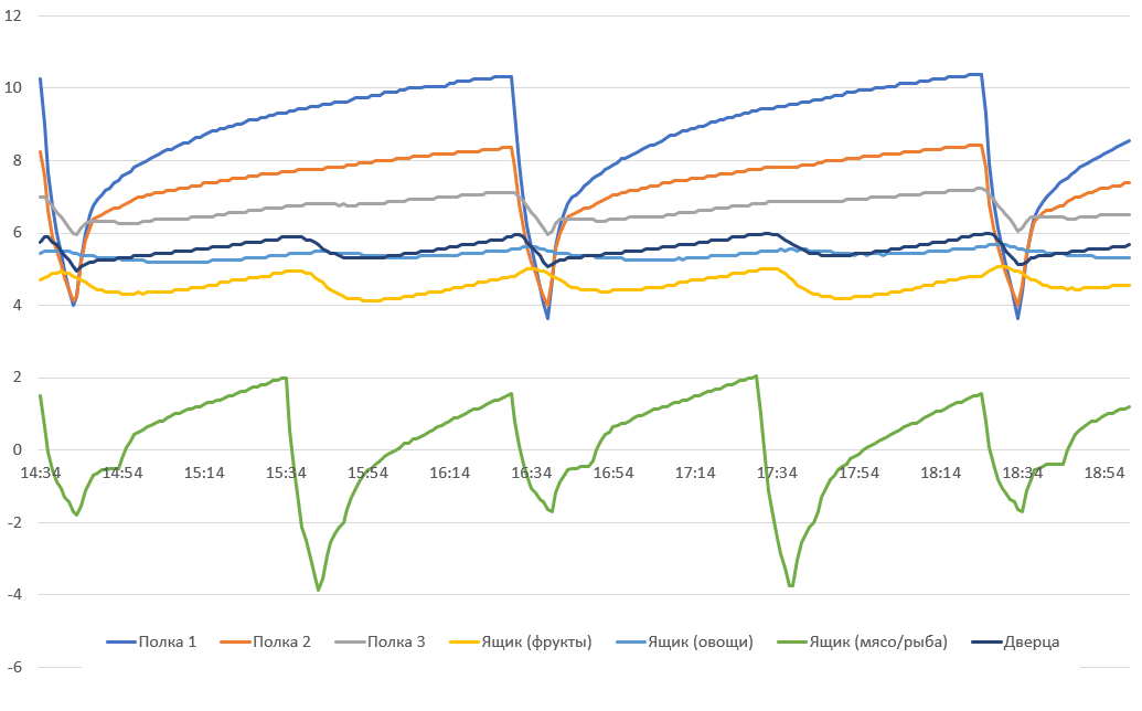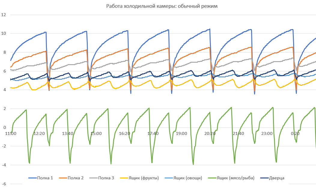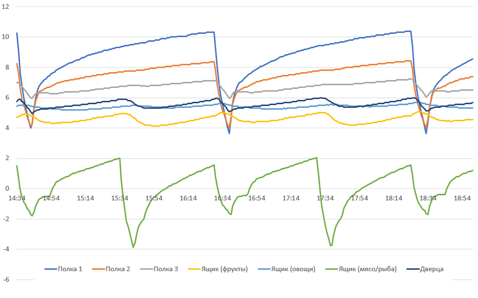 Считаем необходимым еще раз подчеркнуть, что приведенные графики иллюстрируют не потребительские качества холодильника, а особенности логики работы холодильного агрегата и циркуляции холодного воздуха между зонами камеры. Не следует удивляться существенным колебаниям: охлажденные продукты обладают значительно большей тепловой инерцией, нежели воздух в камере, и переносят циклические изменения температуры нормально.