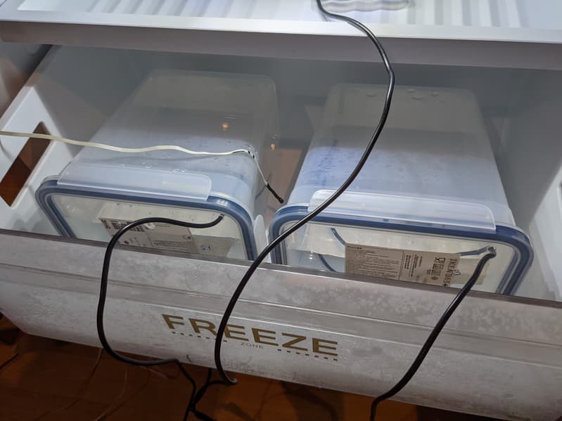 Помимо датчиков температуры воды использовались такие же, но для воздуха. Их мы поместили рядом с контейнерами в те же ящики — так, чтобы поверхность сенсоров не контактировала напрямую с элементами корпуса морозильной камеры.