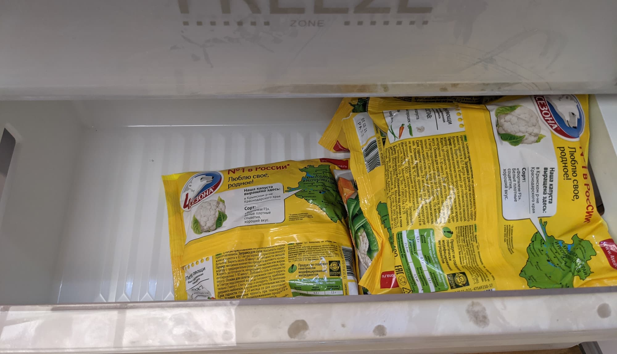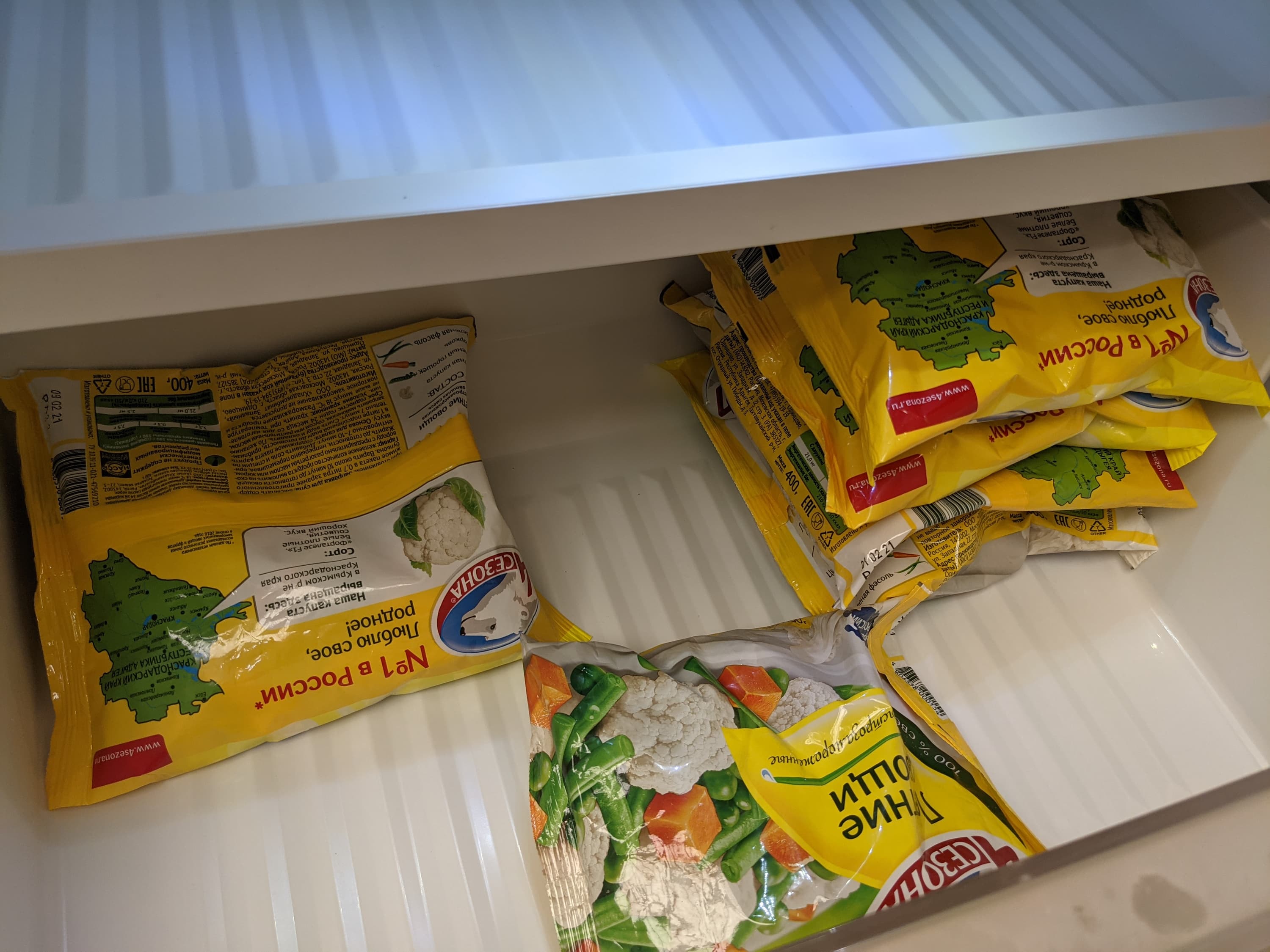 Стандартные пакеты с фруктово-овощной заморозкой размещаются в среднем ящике стопками по пять-шесть штук. Таких стопок в контейнере можно уложить до шести.