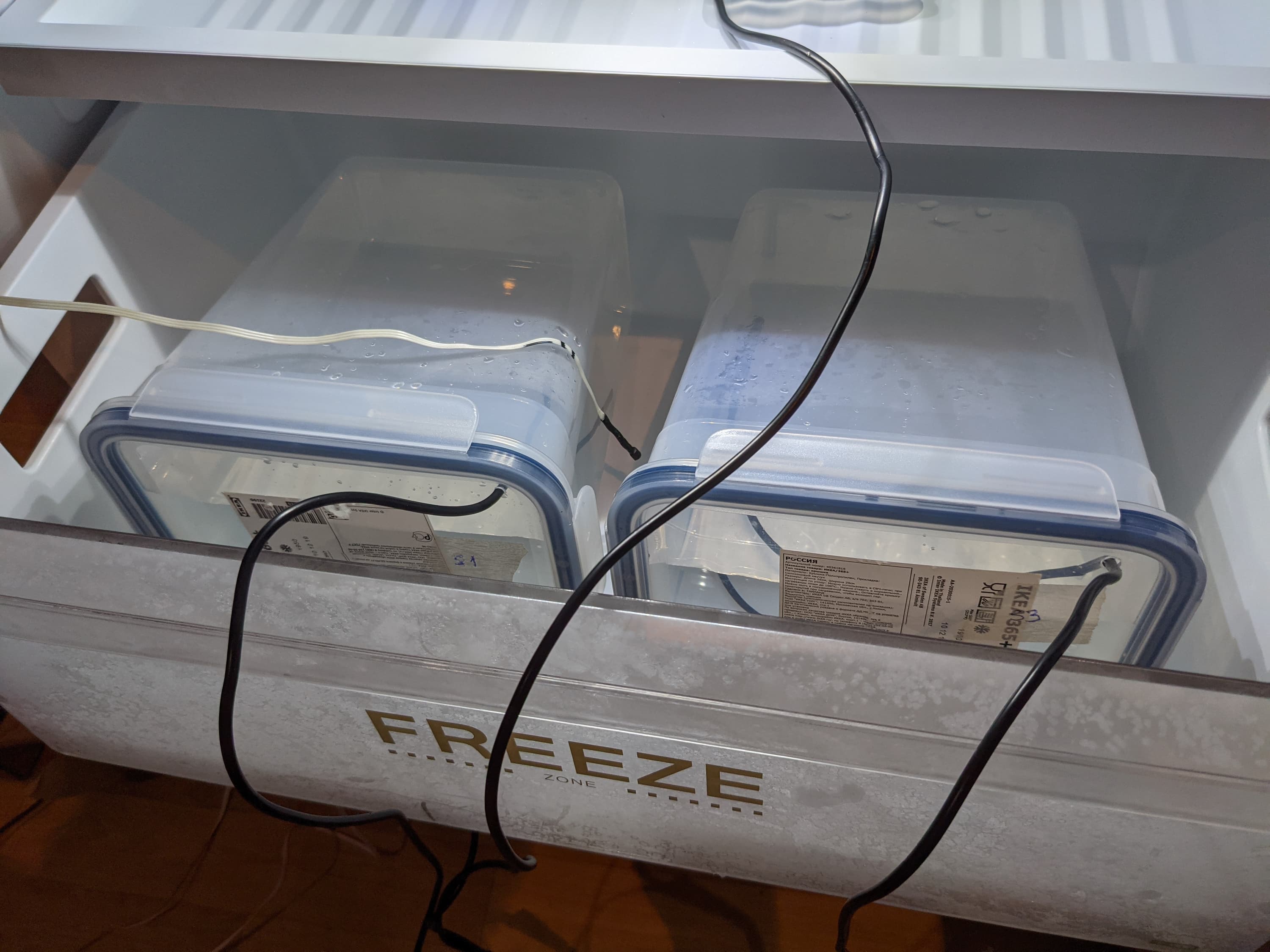 Три термодатчика в герметичном исполнении мы разместили в четырехлитровых пластиковых контейнерах, приобретенных в Икее. Емкости наполнили водой и поставили в два больших ящика морозильной камеры: две в средний и одну — в нижний. Капсулы датчиков располагались по возможности ближе к центру контейнеров.