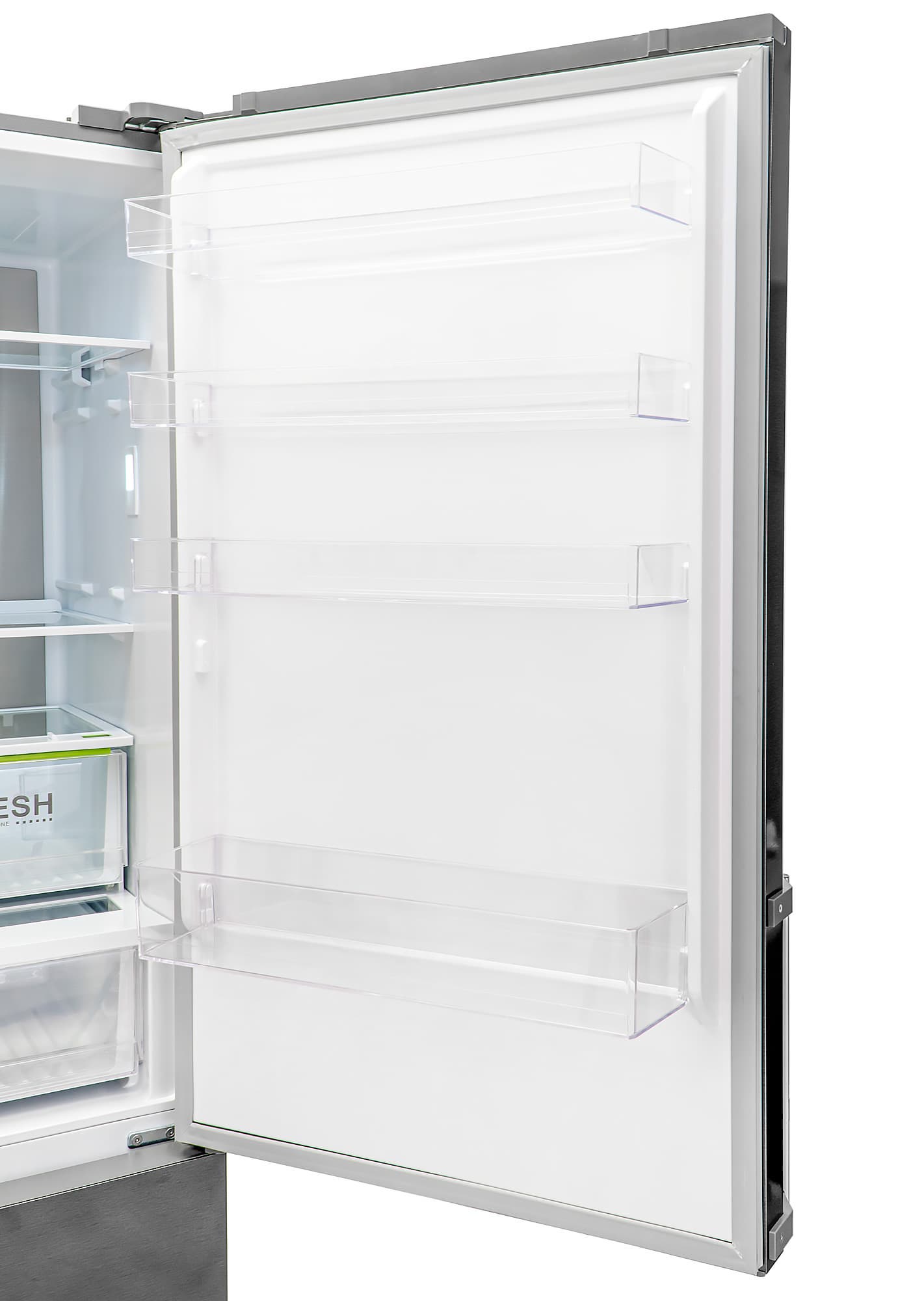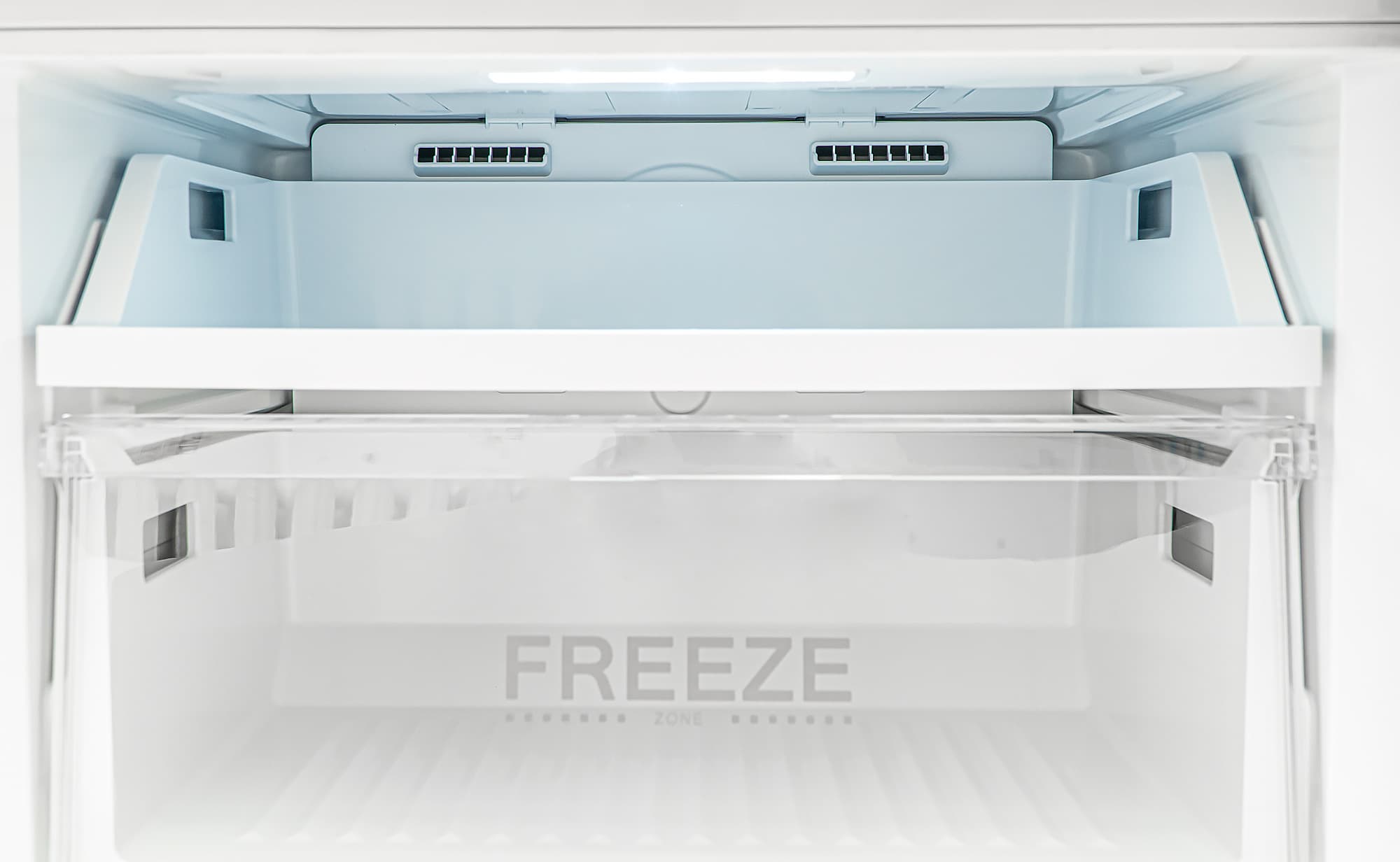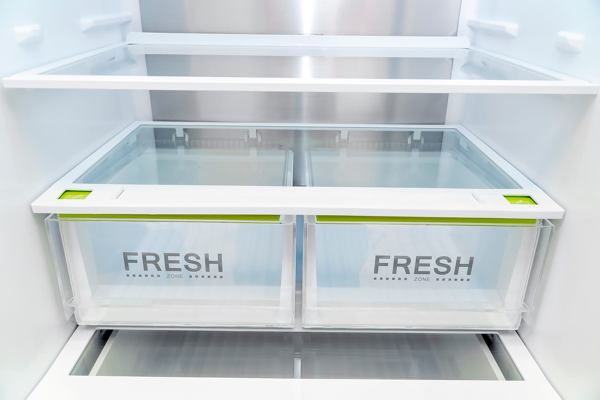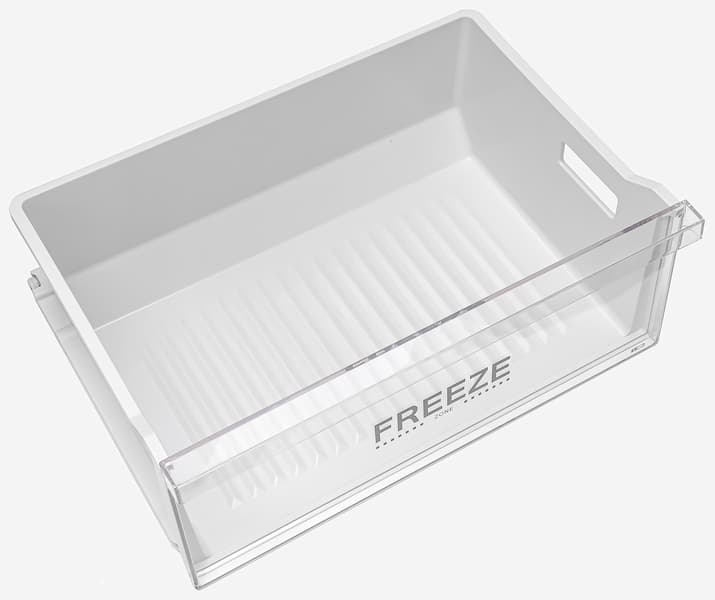 Ящики с маркировкой «Fresh Zone» на полупрозрачной лицевой стороне выдвигаются по пластиковым направляющим. Подразумевается, что хранение овощей и фруктов должно быть раздельным, ведь оптимальный микроклимат для этих продуктов чуть различается.