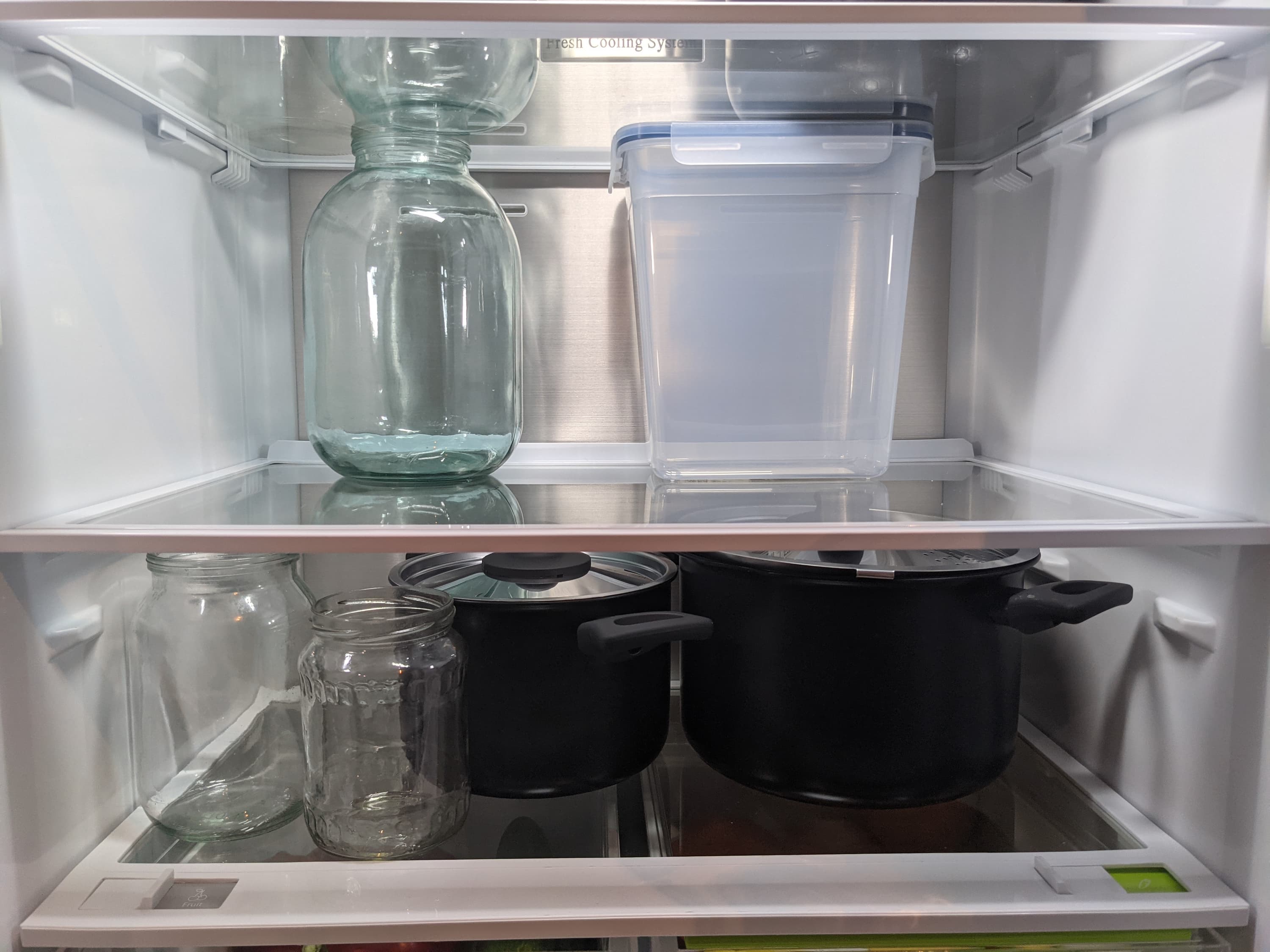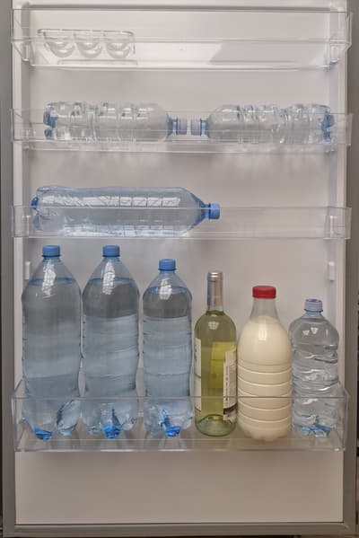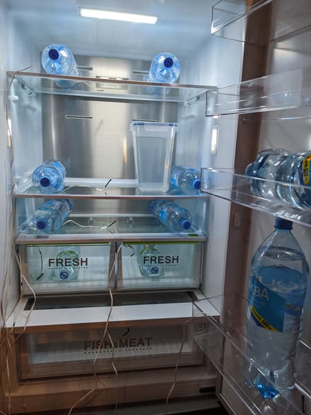 Чтобы имитировать работу загруженного холодильника, в процессе тестирования холодильной камеры мы также использовали водяной балласт в таких же четырехлитровых контейнерах, как и при испытании морозилки. Кроме того, на полках и дверце холодильника положили несколько пластиковых бутылок с водой.