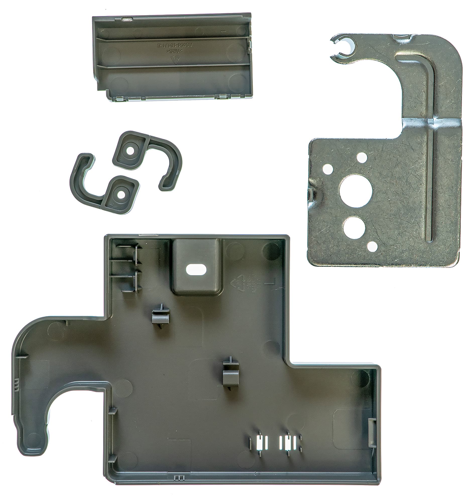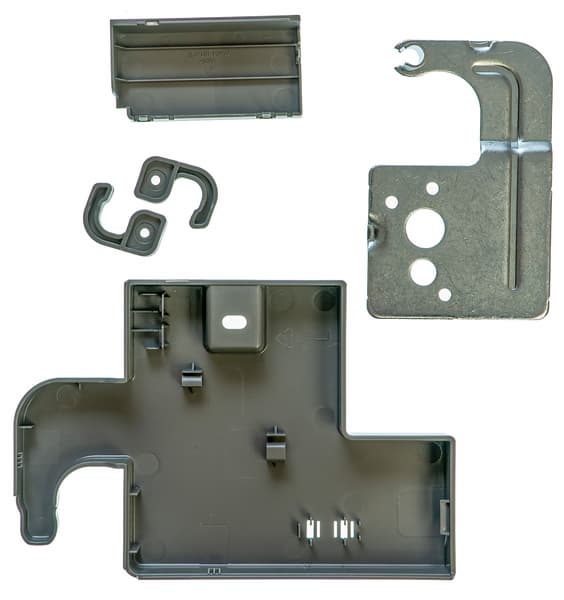 Комплект для перевески дверей состоит из металлического кронштейна и нескольких пластиковых заглушек.