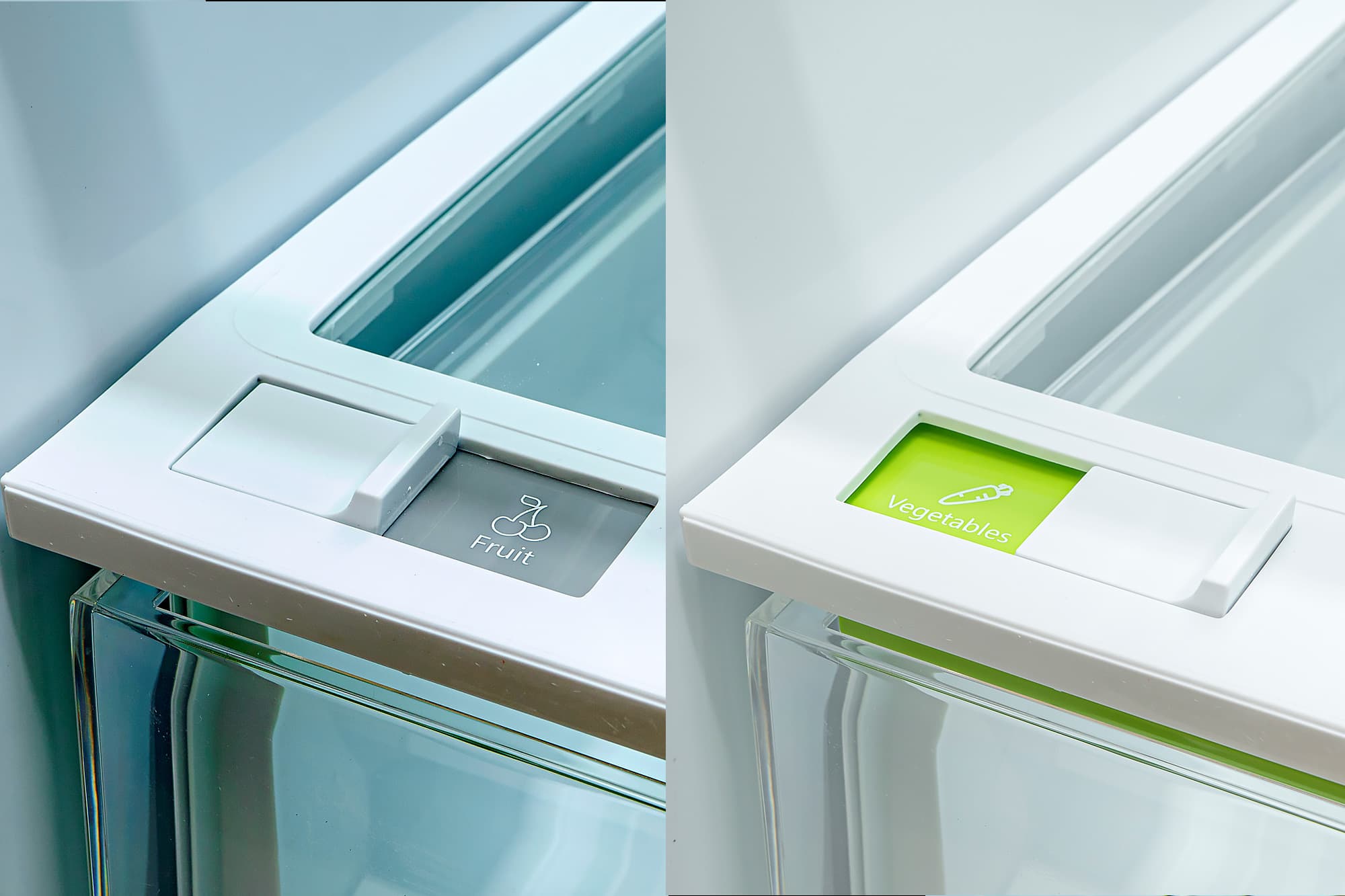 Ящики для овощей и фруктов были настроены по-разному: в первом из них вентиляционная заслонка была поставлена в положение «Fruit» (открыта), а во втором — в положение «Vegetables» (закрыта).