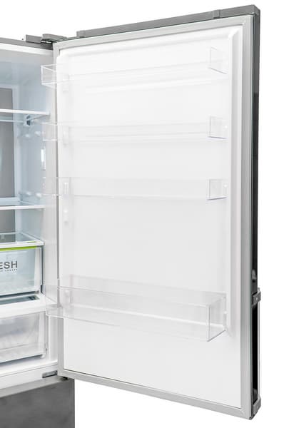 Дверца холодильного отделения снабжена четырьмя съемными полками. Регулировать положение можно только у одной из них — второй снизу.