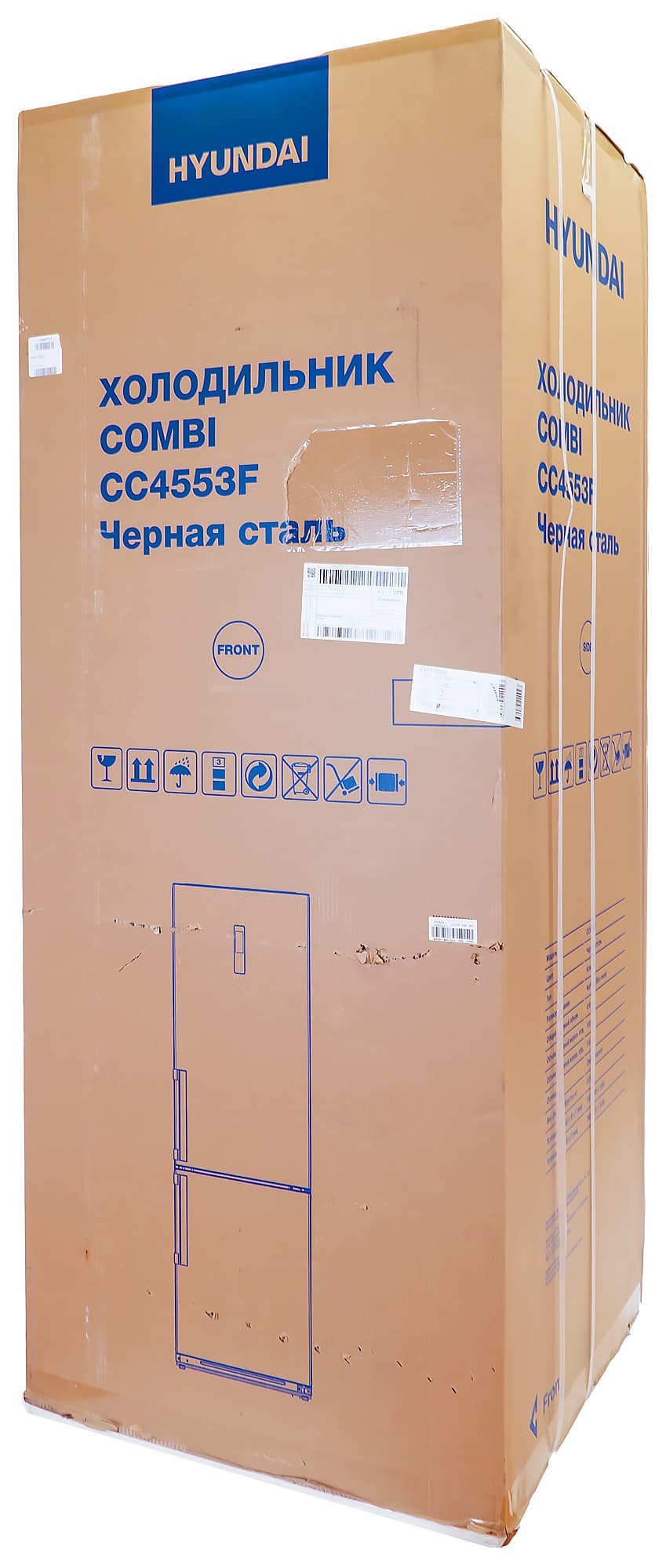 Холодильник упакован в картонный короб c синей печатью. На передней и задней сторонах, помимо названия модели и транспортировочной информации, нанесено схематическое изображение устройства. На боковых напечатаны технические характеристики.