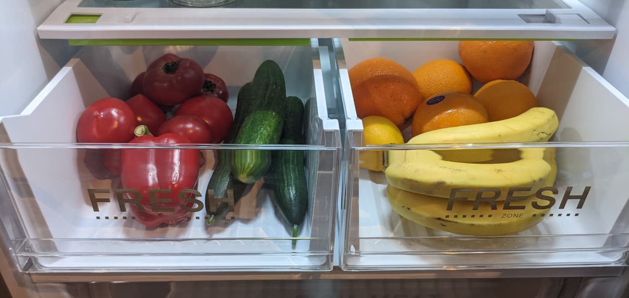 Объем ящиков для фруктов и овощей вполне солидный: на фотографии в овощном хранится по килограмму помидоров и огурцов, да еще перец; во фруктовом — килограммовая гроздь бананов и больше килограмма крупных апельсинов. В обоих контейнерах еще достаточно места.
