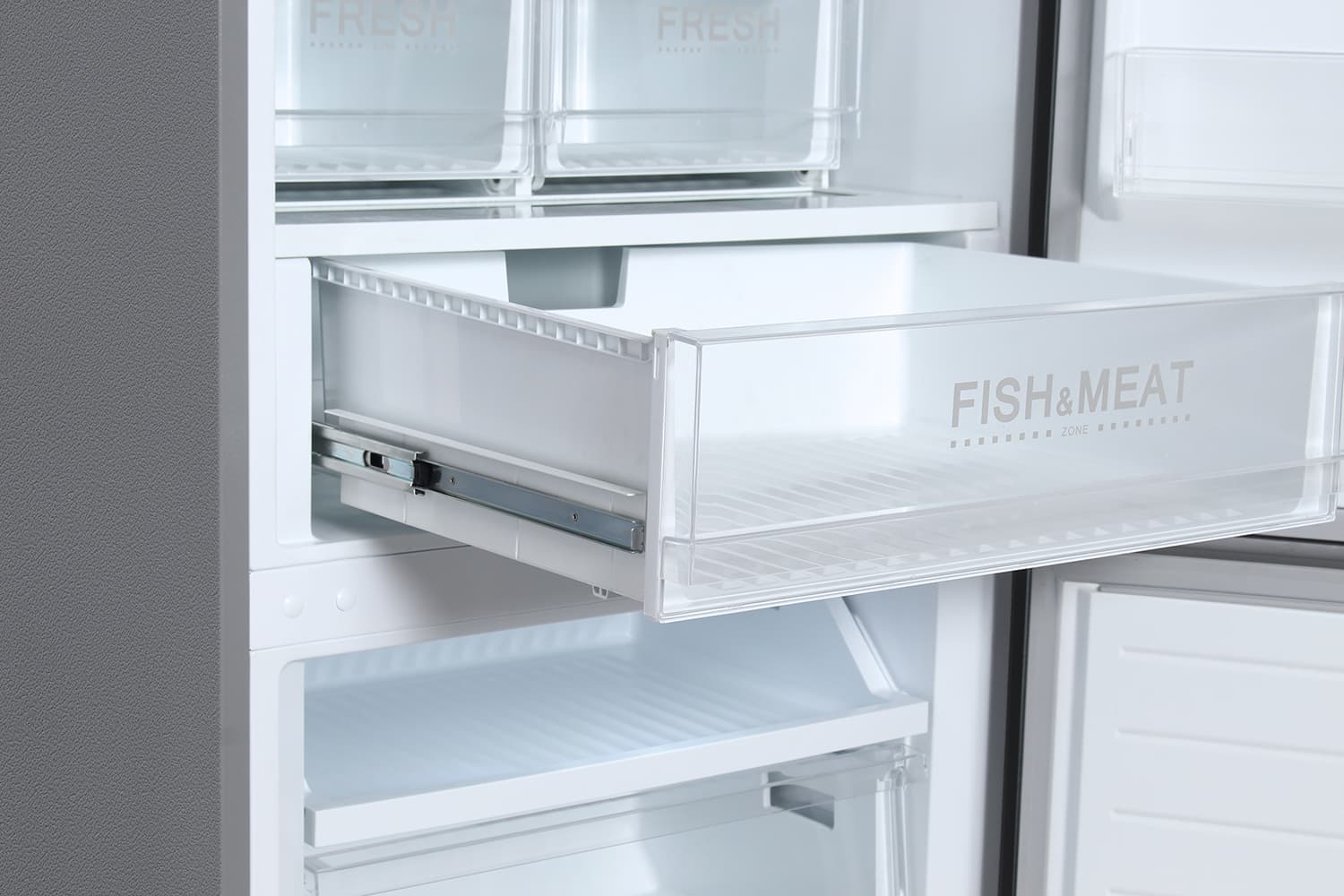 Внушительных размеров ящик для свежего мяса и рыбы легко выдвигается на основательных телескопических металлических направляющих. У зоны «Fish&Meat» нет регулировки вентиляции. По замыслу производителя, данная зона предоставляет условия, аналогичные хранению на льду: рыба или мясо не замораживаются, но хранятся дольше обычного.