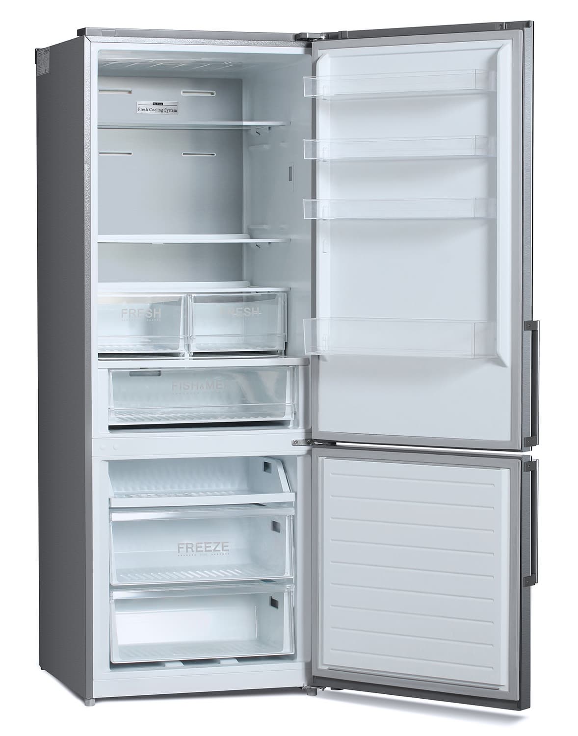 В холодильном отделении три открытых полки, два отдельных ящика для овощей и фруктов, расположенных параллельно и один, самый нижний — для свежих продуктов.