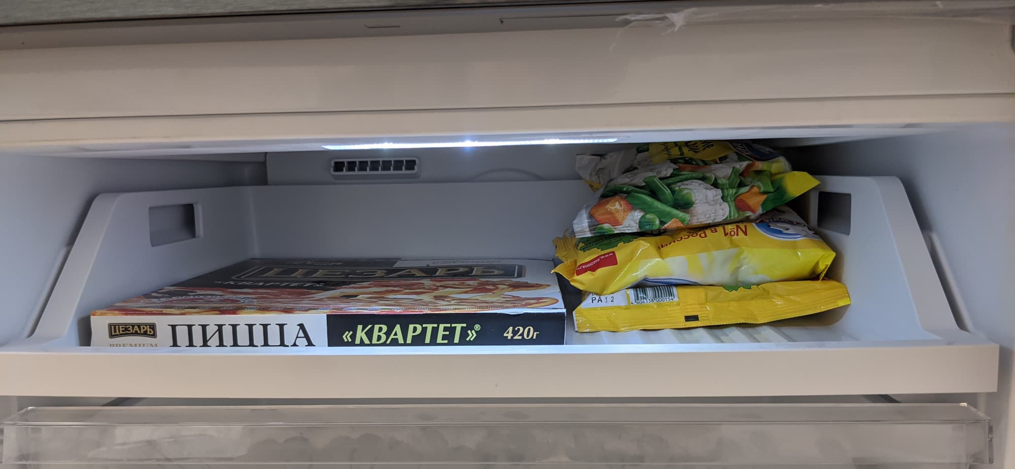 В верхнем лотке морозильной камеры можно разместить пять-шесть коробок с пиццей. Рядом со стопкой остается свободное пространство, позволяющее положить три-четыре пакета замороженных овощей или фруктов.