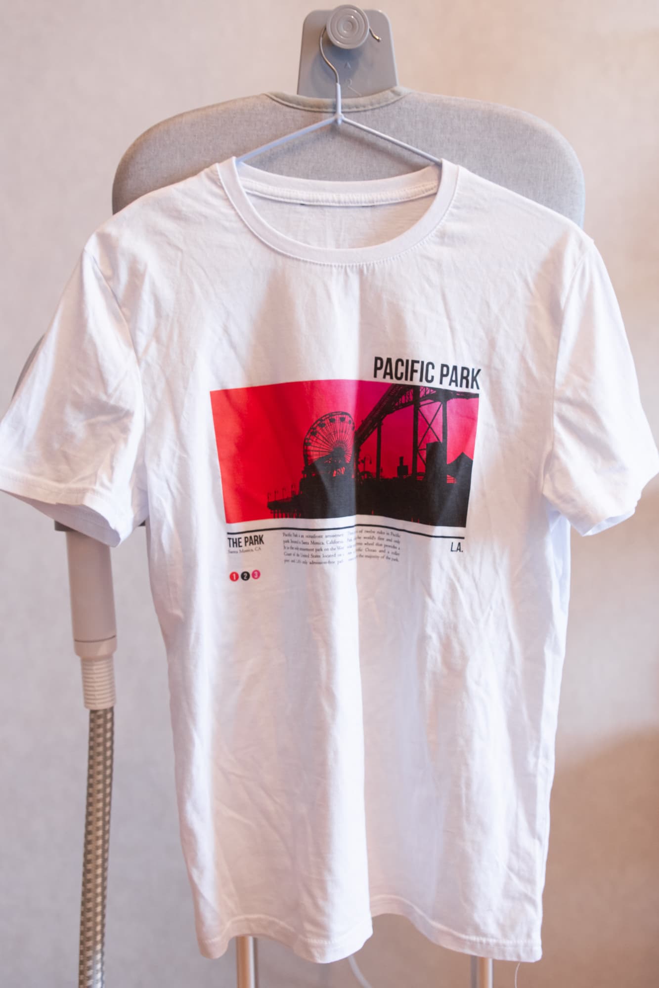 Тест с футболкой из хлопчатобумажной ткани мы провели с целью выяснить, насколько качественно и бережно отпариватель приведет в порядок вещь с ярким принтом.