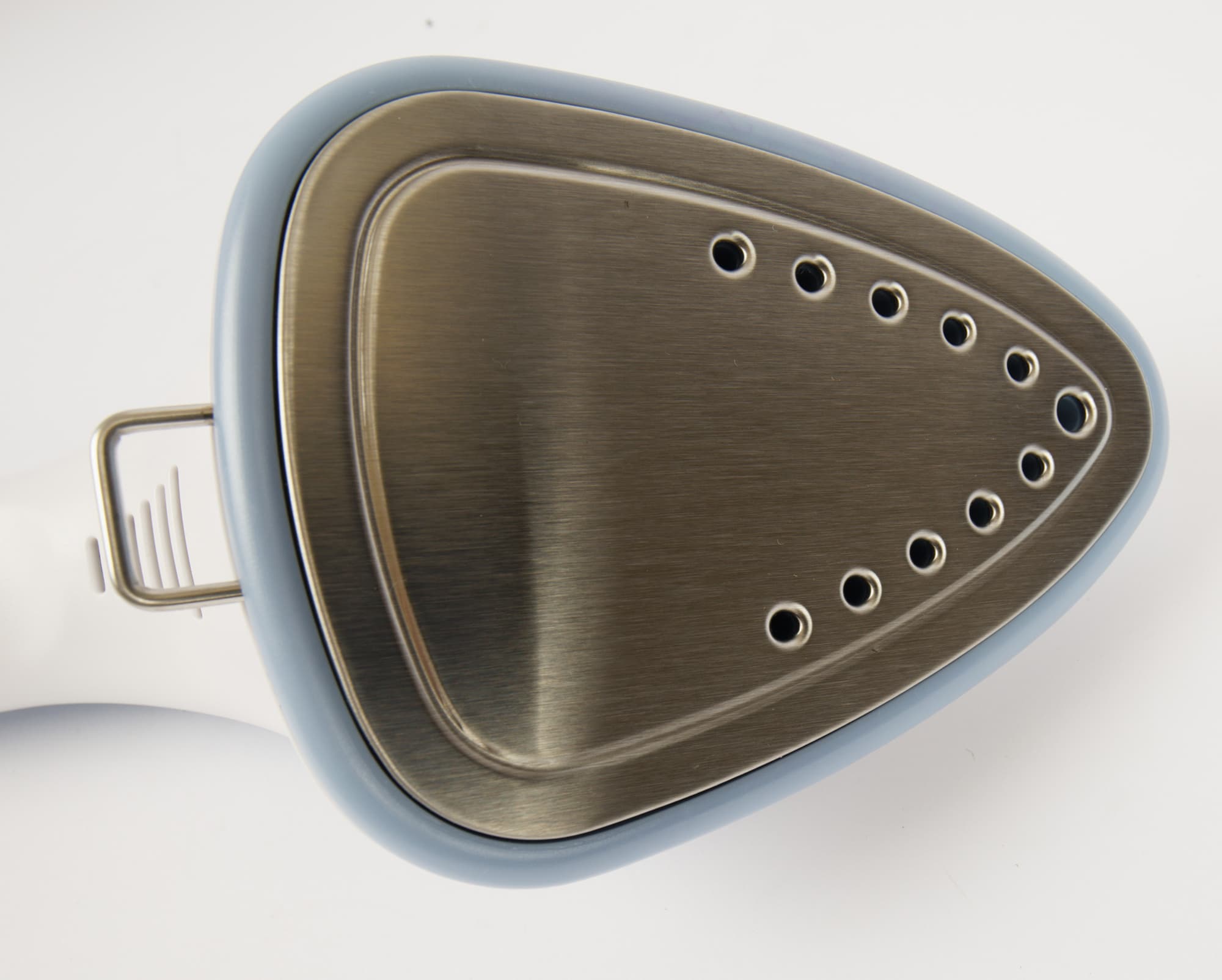 Длина ручки парового утюжка около 17 см. С внешней и внутренней стороны ручки сделаны вентиляционные отверстия. Подошва утюжка треугольной формы имеет крупные отверстия для выхода пара. Металл хорошо обработан — никаких зазубрин и царапин мы не обнаружили.