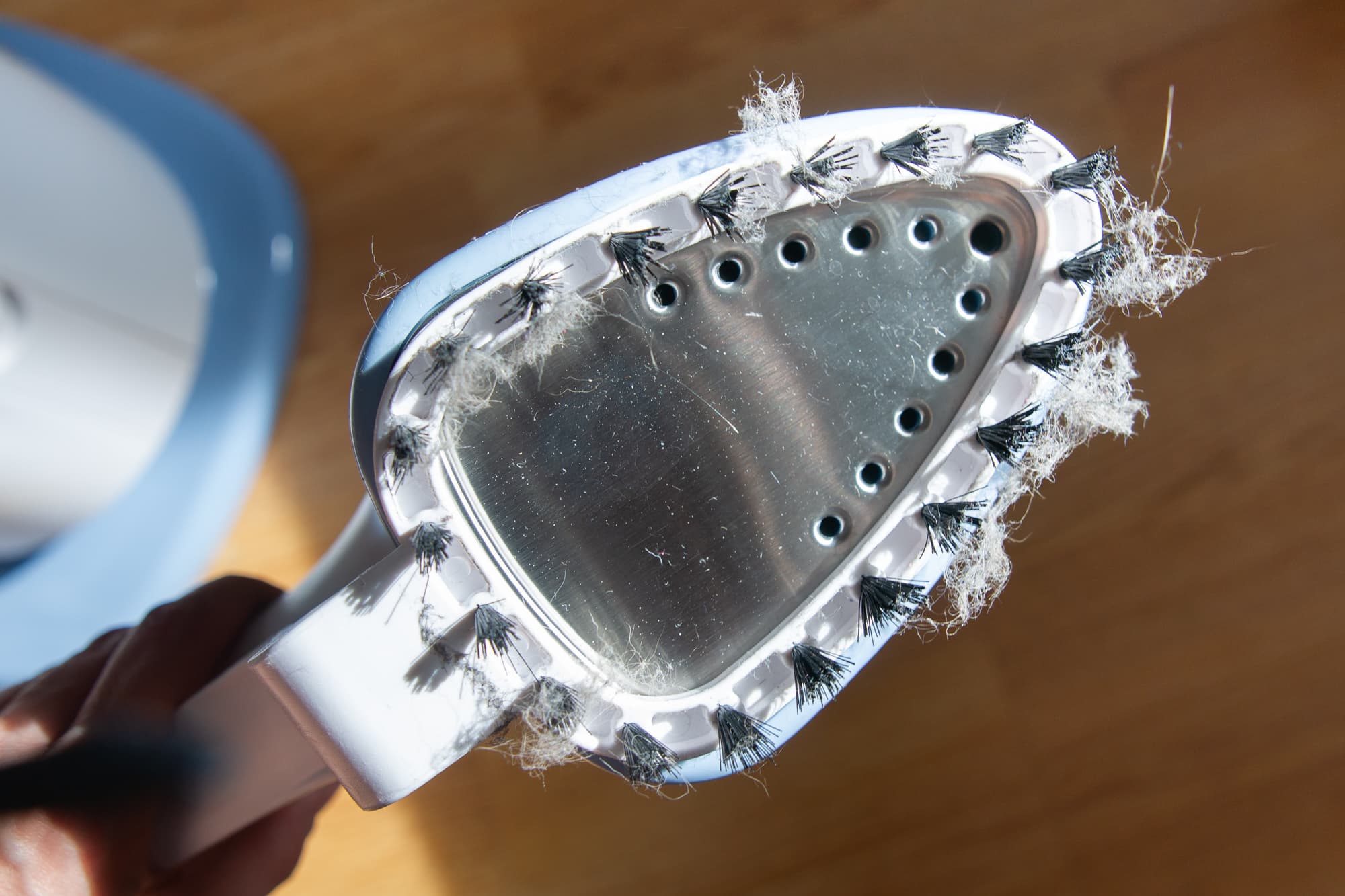 Щетка оказалась достаточно жесткой для качественного удаления пыли и шерсти. За считанные минуты на максимальной мощности подачи пора она собрала все, что было на поверхности. Правда, хотя прижимали мы утюжок не очень сильно, щетина в процессе очистки немного погнулась. За 5 минут обработки материала на кресло попало некоторое количество капель, но спустя короткое время все высохло.