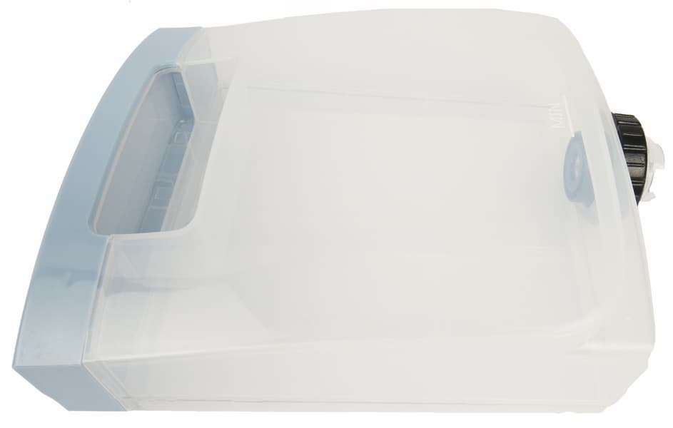 Емкость для воды объемом 1,5 л изготовлена из прозрачного пластика. На передней стенке есть выемка для извлечения резервуара из корпуса. В нижней части — отметка о минимальном объеме воды. Отверстие для залива воды диаметром 3,5 см закрывается завинчивающейся пластиковой пробкой. Откручивается деталь без усилий, с внутренней стороны она уплотнена резиновой прокладкой.