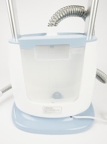 Минусом мы бы назвали недостаточную, по нашему мнению, длину электрошнура и шланга подачи пара. При очистке мебели или отпаривании висящих на окне штор это становится проблемой. Также нам кажется утомительной необходимость каждый раз после использования прибора удалять воду под местом, куда устанавливается резервуар. Еще одним недостатком можно назвать появление воды на ткани при горизонтальном отпаривании. Правда, как мы уже отметили в практических тестах, высыхает она быстро и бесследно.