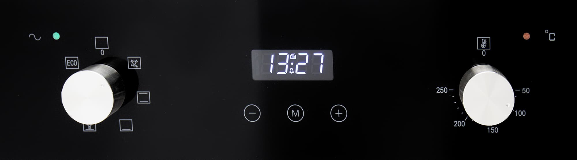 Устанавливаются все необходимые для работы духовки параметры с помощью трех сенсорных кнопок и двух поворотных регуляторов (левый отвечает за режимы, правый — за температуру).
