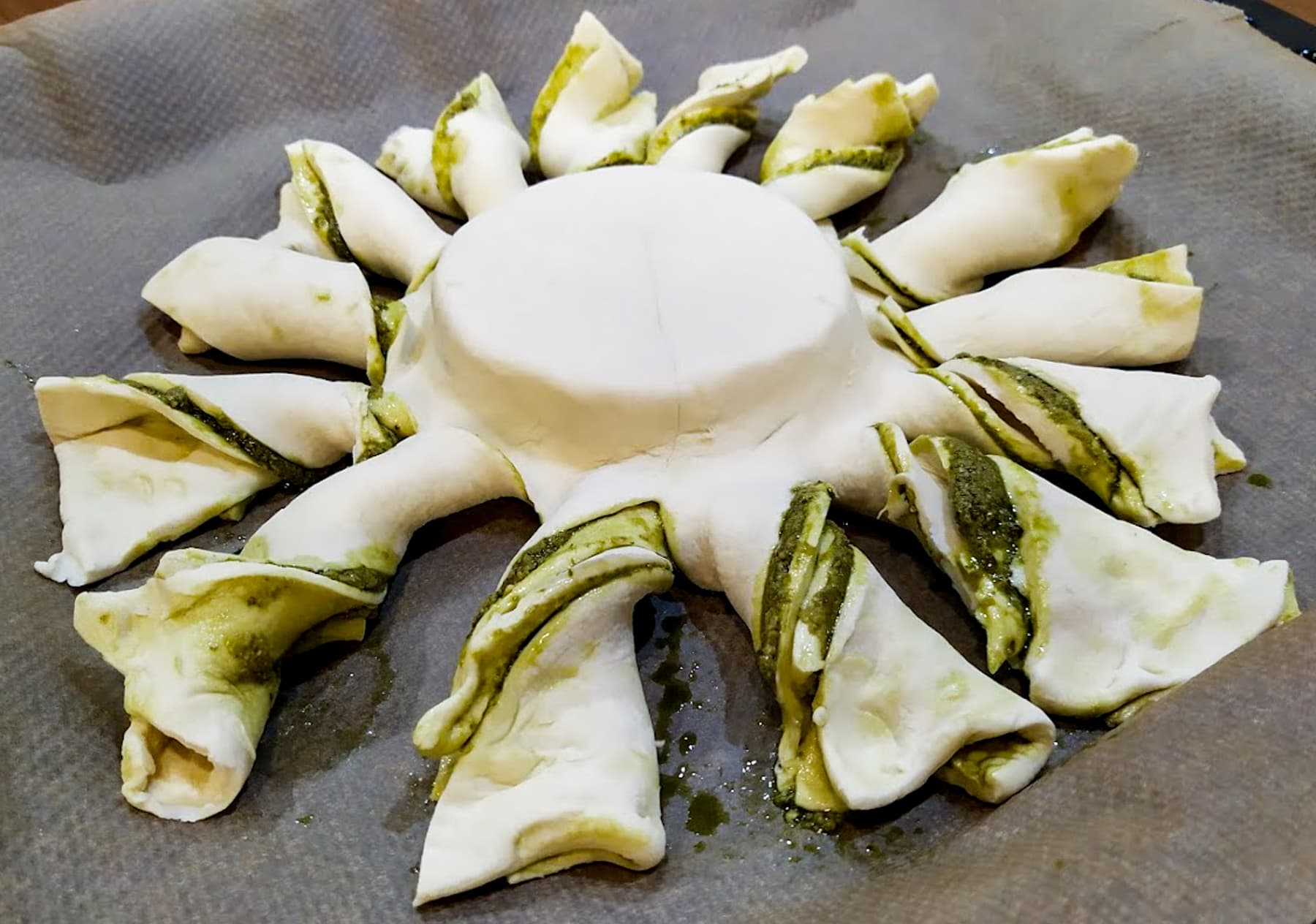 Кусок камамбера нашпиговали чесноком и укутали в слоеное тесто, промазанное песто, смазали желтком и поставили в духовку в режиме верхнего и нижнего нагрева при температуре 200 °C.