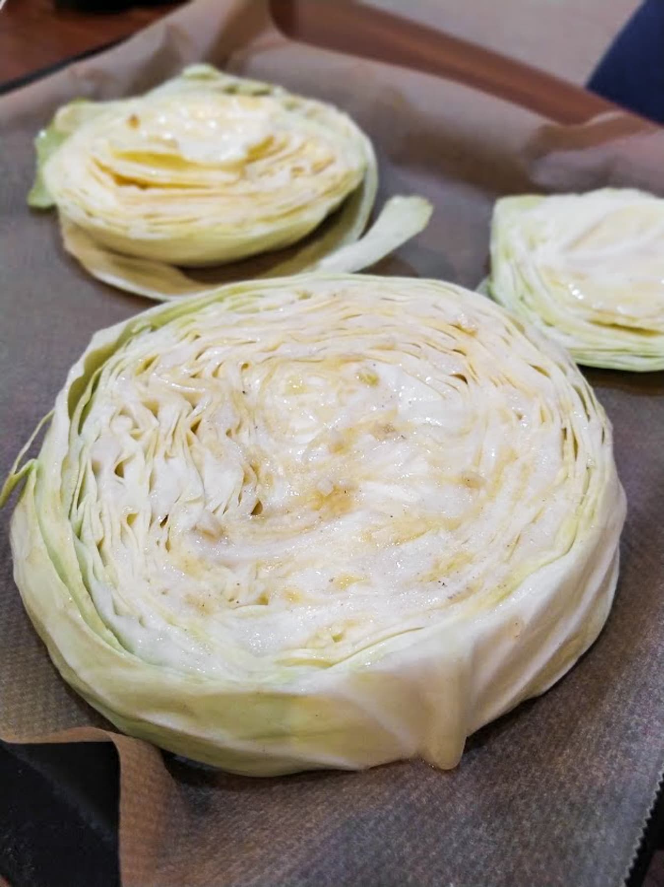 Не остались обделенными и дегустаторы-вегетарианцы. Для них мы приготовили капустные стейки. Кочан нарезали шайбами по 2 см толщиной и смазали их оливковым маслом со специями. Наши лабораторные запасы истощились, поэтому мы использовали чеснок и перец, хотя не помешала бы паприка или прованские травы.