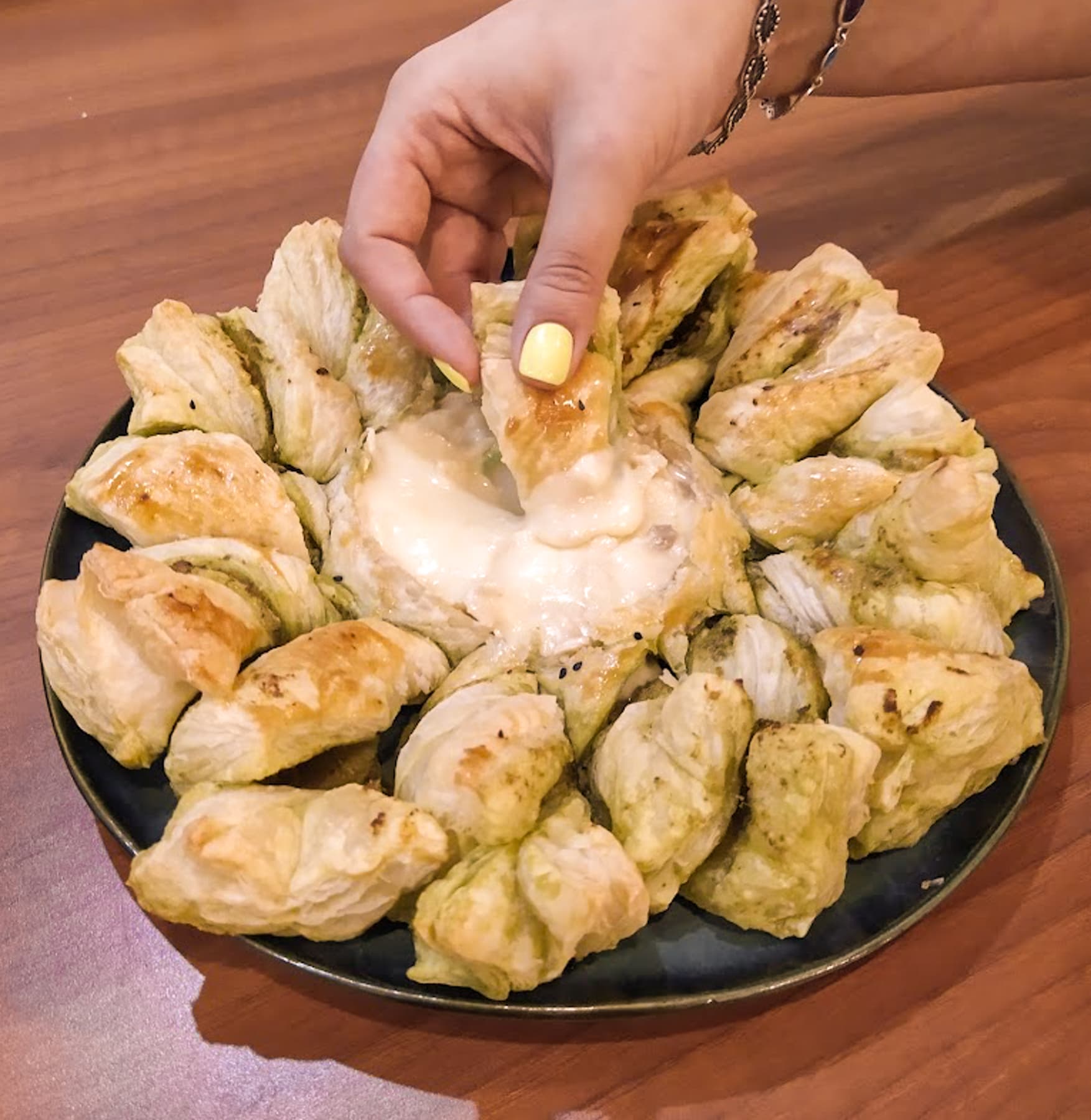 Замечательный вариант горячей закуски для вечеринки: каждый отламывает себе «лепесток» с песто и макает его в расплавленный ароматный камамбер. Кстати, вместо песто можно использовать классическое дополнение к сыру — клюквенный или брусничный джем.
