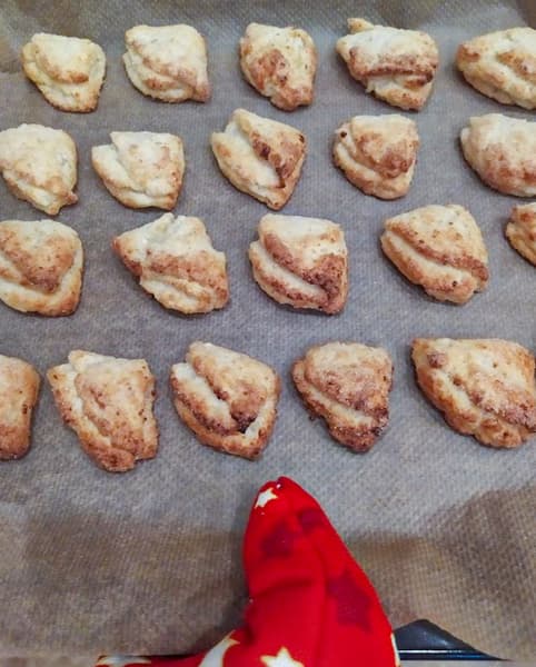 Мы порубили ножом творог, масло и полтора стакана муки, замесили тесто и положили его в холодильник на полтора часа. Затем скатали из теста колбаску, нарезали шайбочками и налепили из них печенюшки, называемые в народе «гусиные лапки».