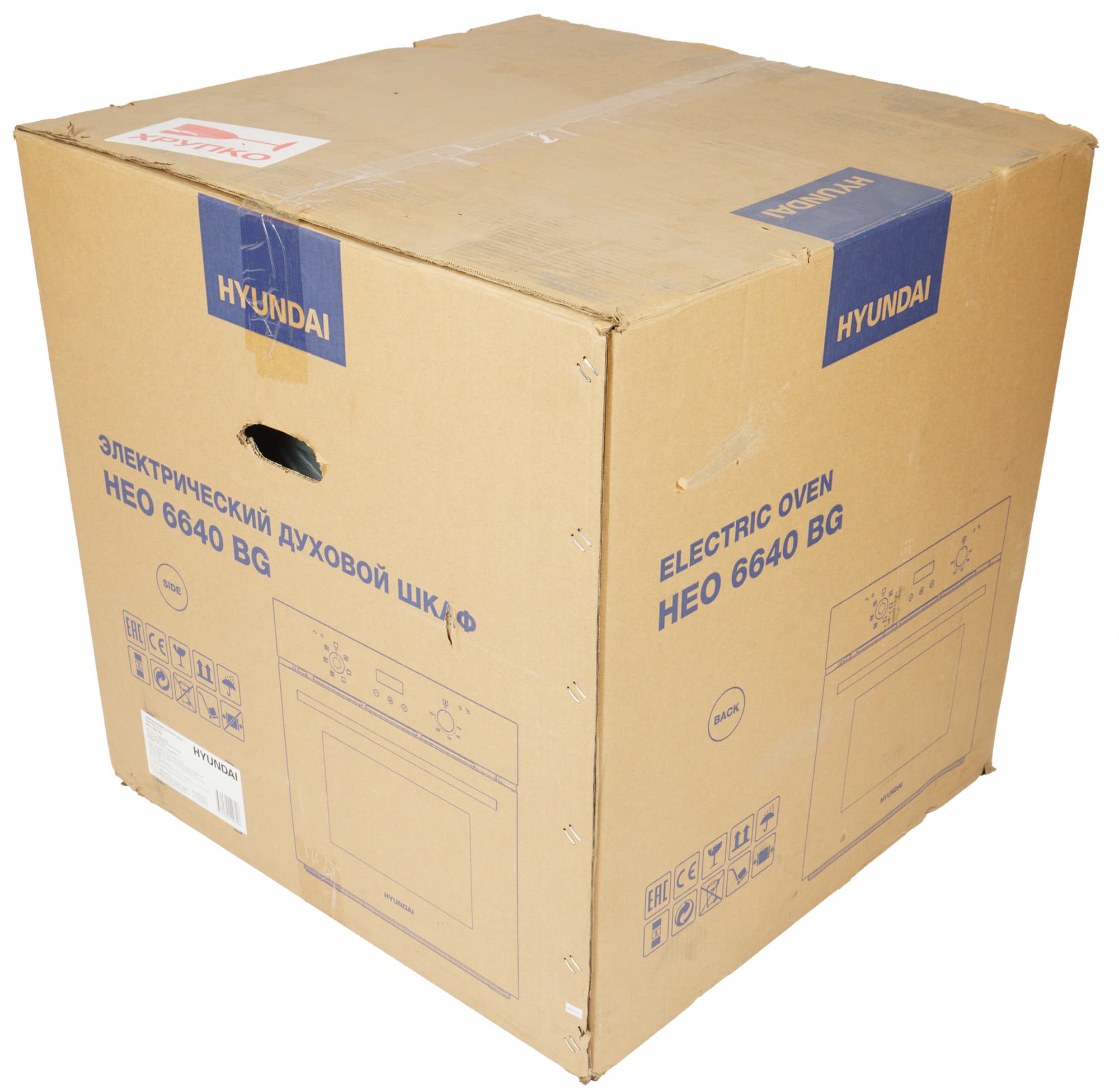 На коробке, в которой поставляется Hyundai HEO 6640 BG, есть только изображение печи и условия транспортировки. Переносить ее удобно благодаря прорезям по бокам.
