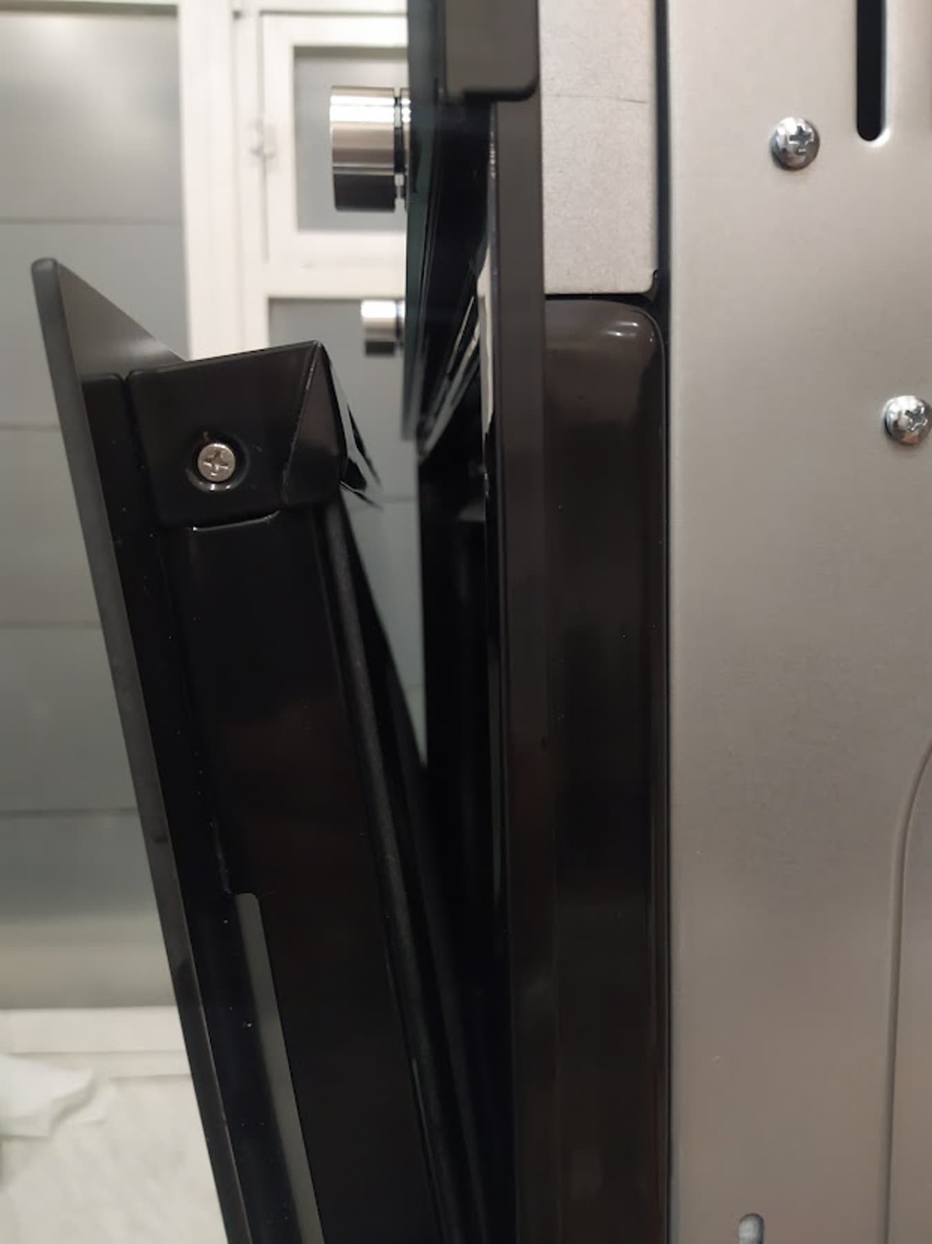 Съемная дверца из трех стекол открывается с небольшим усилием, движется плавно и фиксируется в любом положении. Когда дверца почти закрыта, срабатывает доводчик.