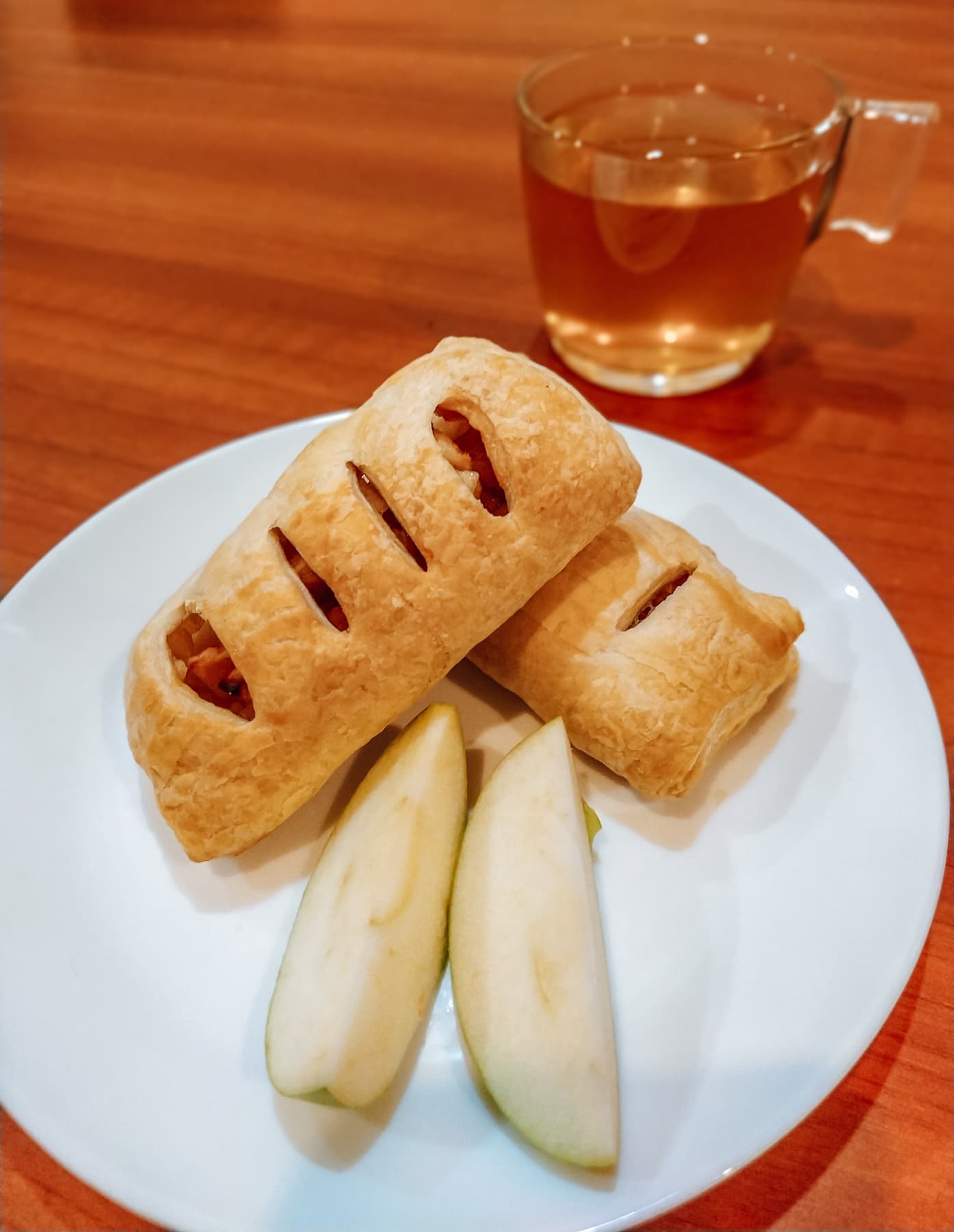 Через 20 минут у нас начался углеводный пир. Слойки поднялись и пропеклись как надо, а крахмал не дал растечься сиропу из начинки. Кстати, у нас не осталось подтверждающего фото, но слойки, которые лежали у дверцы, подрумянились сильнее других.