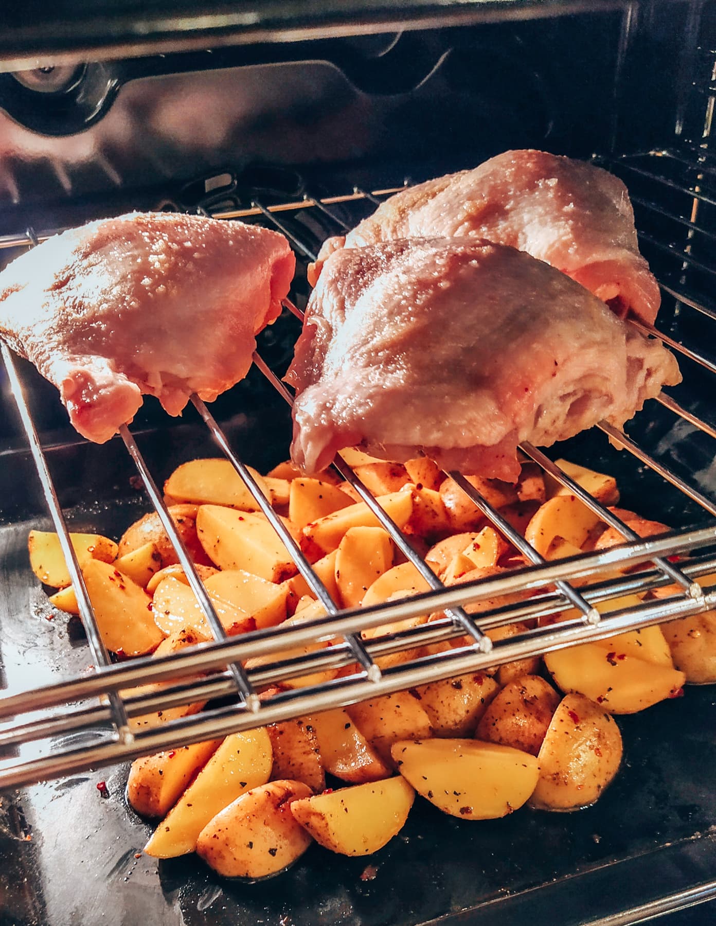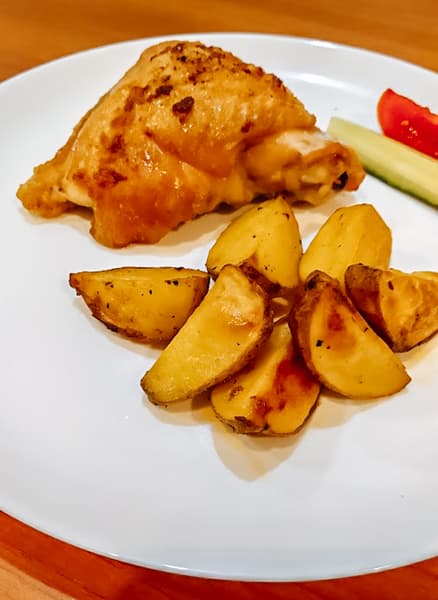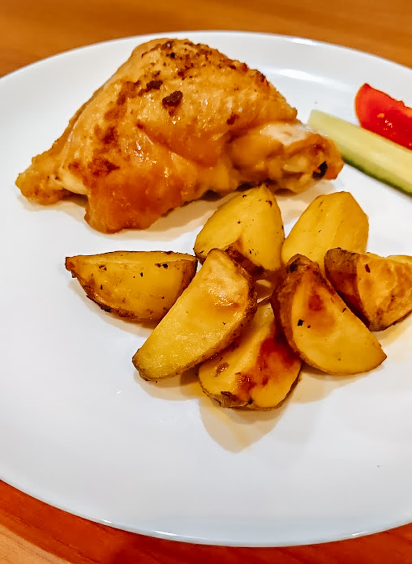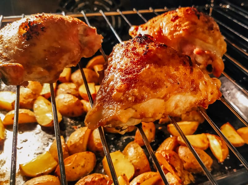 Решили приготовить оба компонента для ужина одновременно. В противень положили картофель со специями, а на решетку — куриные бедра, сдобренные солью и сушеным чесноком. Для начала включили большой гриль на 180 °C. Когда курица приобрела золотистый цвет, отключили гриль и перешли на конвекцию.