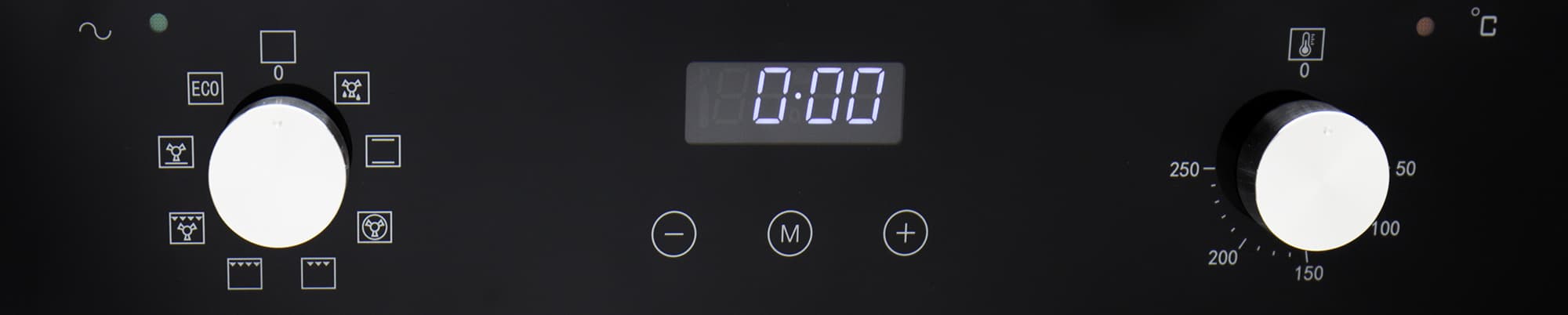 Устанавливаются все необходимые для работы духовки параметры с помощью трех сенсорных кнопок и двух поворотных регуляторов (левый отвечает за режимы, правый — за температуру).