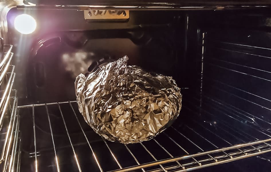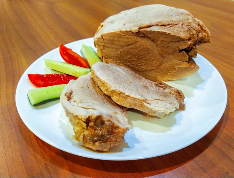 Небольшой свиной «орешек» чуть больше килограмма весом мы ночь выдерживали в пряном рассоле, затем подержали при комнатной температуре, после чего завернули в фольгу и отправили в разогретую до 200 °C духовку при верхнем и нижнем нагреве. Полчаса подержали мясо на высокой температуре, затем уменьшили нагрев и два часа занимались своими делами.