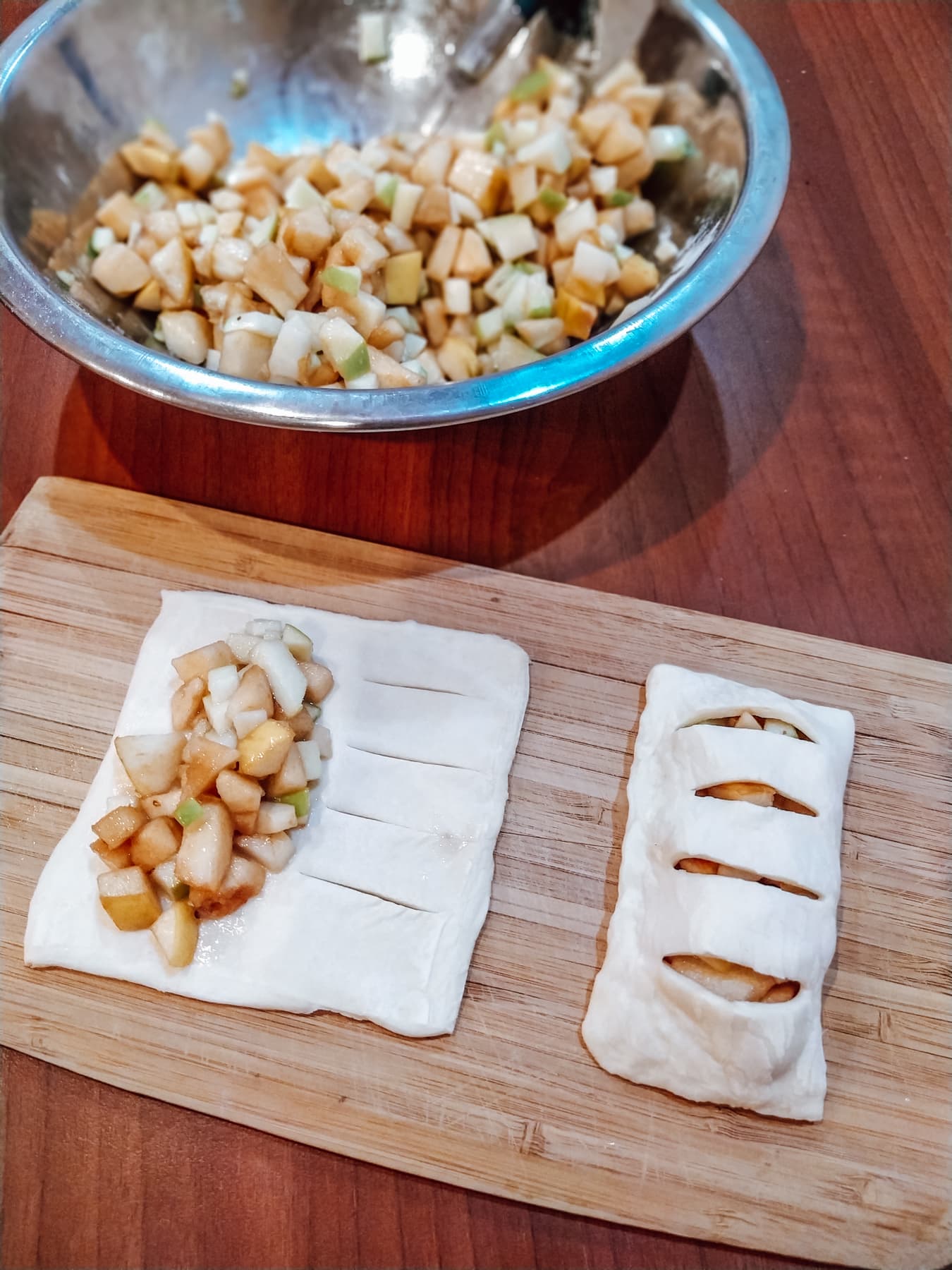Настало время десерта. Яблоки нарезали кубиками, смешали с сахаром и крахмалом и завернули в слоеное тесто.