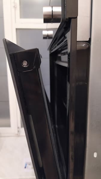 Дверца из трех стекол при необходимости снимается. Она легко открывается, движется плавно и фиксируется в любом положении. Угол к вертикальной поверхности, при котором срабатывает доводчик, минимальный — градусов 10 от силы. Стекло прозрачное, через него отлично видно, что происходит в камере.