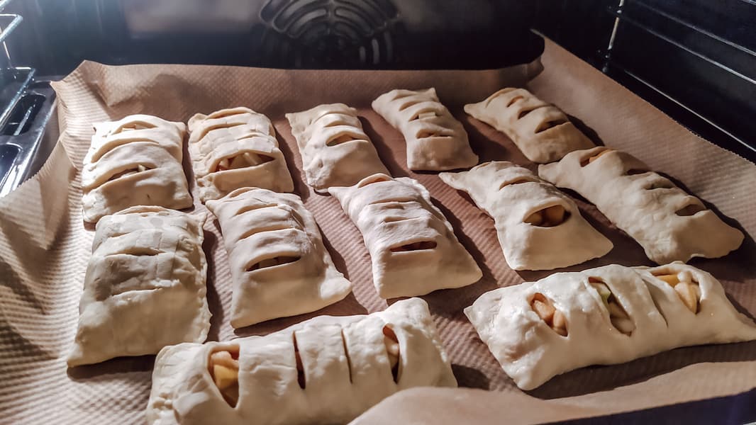 Получился целый противень слоек. Мы поставили его на третий снизу уровень, выбрав режим «Конвекция и нагрев снизу» и температуру 180 °C.