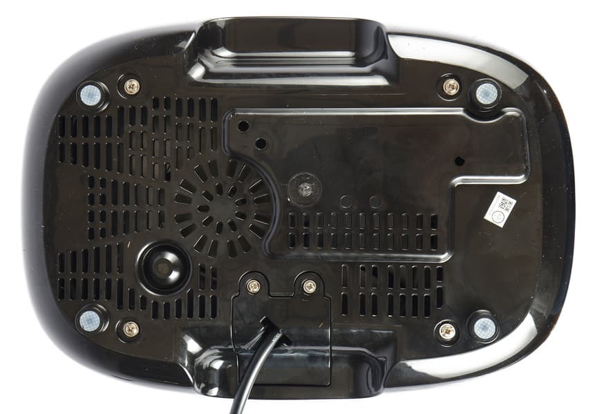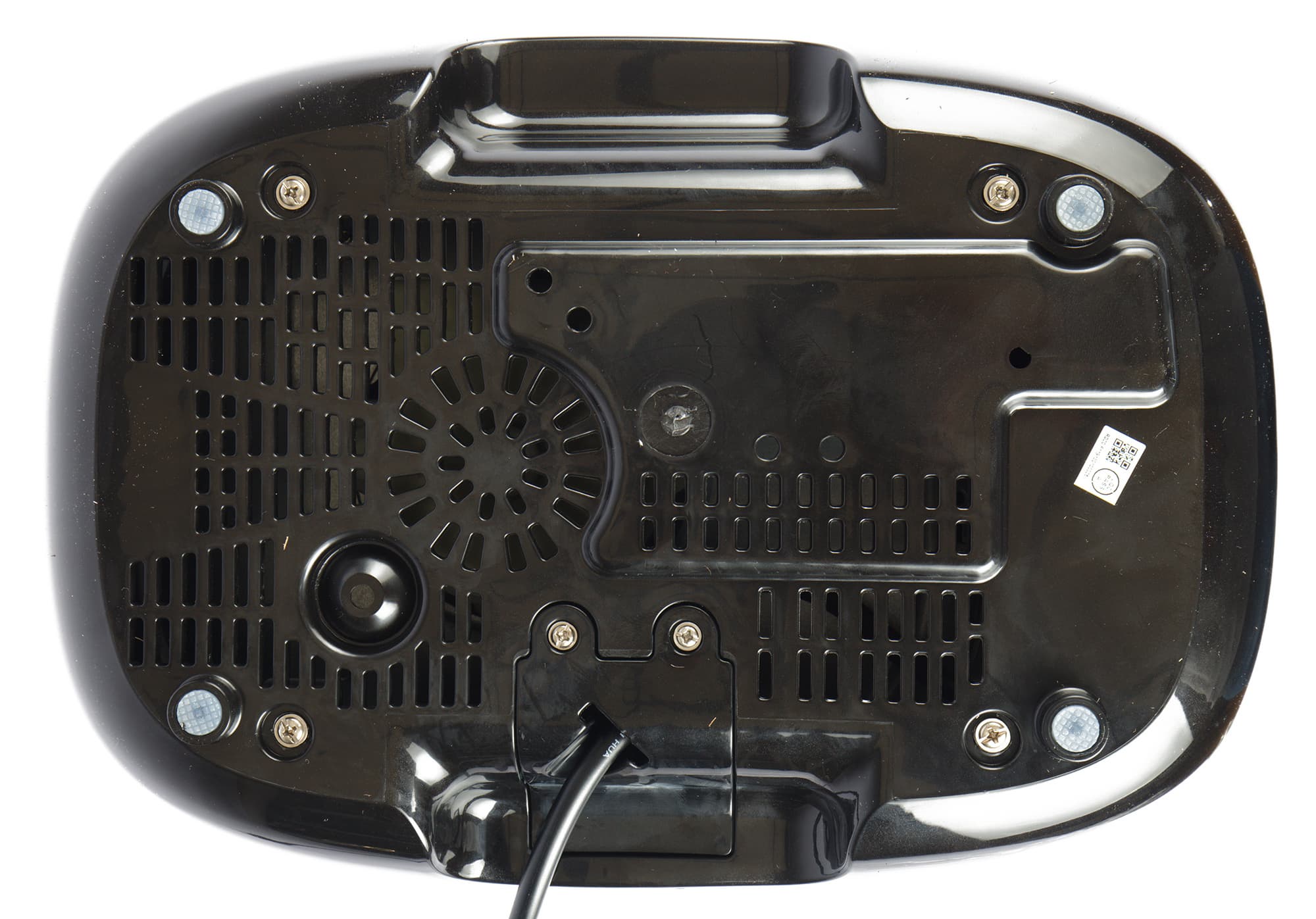 Хлебопечка стоит на четырех небольших прорезиненных ножках. Выход шнура электропитания расположен снизу.