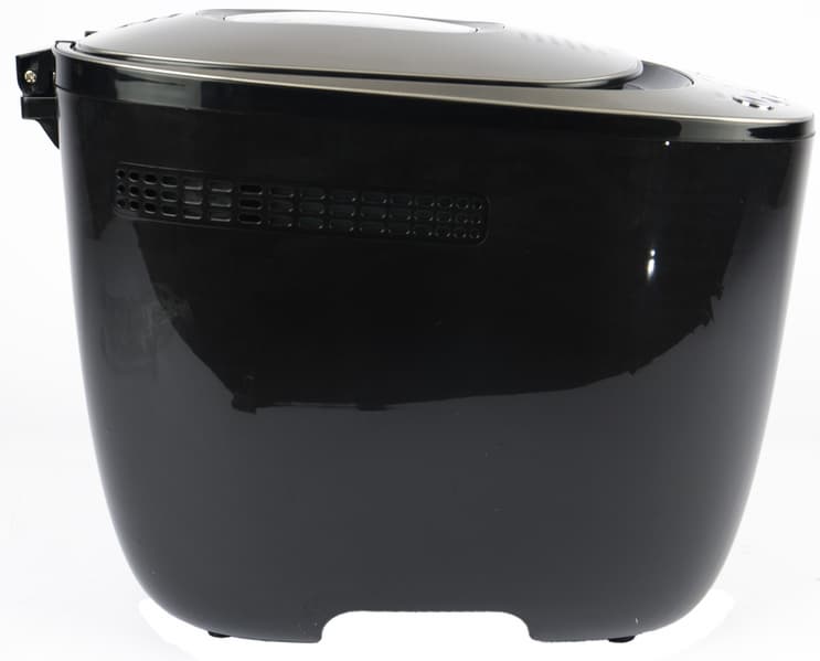 Хлебопечка прибыла на тесты в картонной коробке черного цвета с картинками и большим логотипом компании на боковых поверхностях. Кроме этого, на коробке мы видим технические характеристики, рабочие пиктограммы, штрих коды и надпись «хрупко». Ручек или прорезей для переноски на коробке нет, но и размер ее не очень большой.